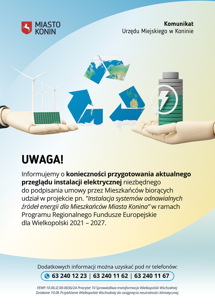 Na zdjęciu widać plakat z komunikatem o koniecznym przeglądzie instalacji elektrycznej. Dotyczy to mieszkańców uczestniczących w projekcie "Instalacja systemów odnawialnych źródeł energii dla mieszkańców miasta Konina".