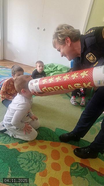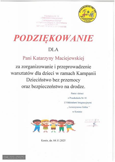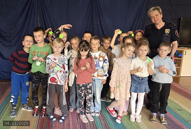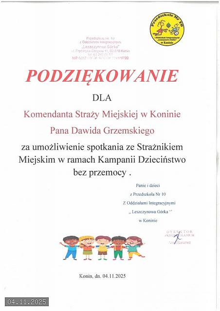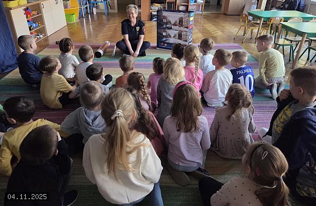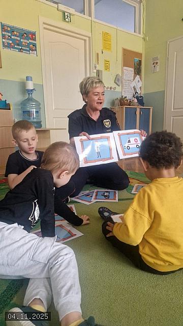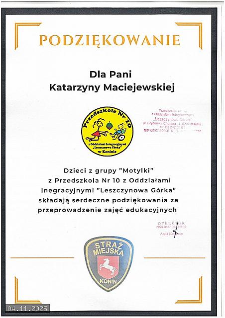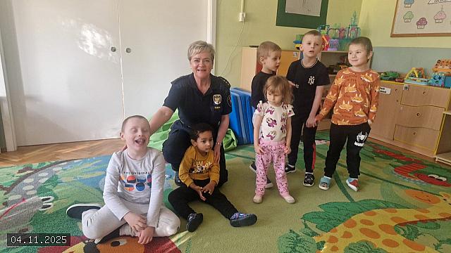 W dniu 04 listopada 2025 roku Przedszkole nr 10 „Leszczynowa Górka” z Oddziałami Integracyjnymi w siedzibie przy ul. Chopina 11 w Koninie, odwiedziła funkcjonariuszka Straży Miejskiej w Koninie starszy inspektor Katarzyna Maciejewska, która przy użyciu kolorowych planszy oraz pomocy dydaktycznych przeprowadziła warsztaty na tematy bezpieczeństwa.