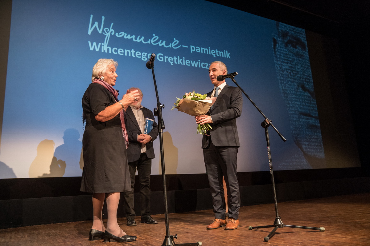 Trzeba przyznać, że Andrzej Moś ma niezwykły dar przekonywania do projektów filmowych o trudnej do przecenienia wartości nie tylko instytucji ale i... samych bohaterów oraz młodych ludzi, których angażuje bezpośrednio w proces tworzenia filmu. Tak było i tym razem - młodzi filmowcy stali się współtwórcami filmu zatytułowanego „Wspomnienie - pamiętnik Wincentego Grętkiewicza”, którego premiera odbyła się w poniedziałkowy wieczór (18 listopada) w KDK. Przybyli na nią licznie potomkowie Pana Burmistrza, którzy przy okazji zrealizowali marzenie wielu Grętkiewiczów i odbyli zjazd rodzinny. Najpierw jednak w ogromnym napięciu i z niezwykłym zainteresowaniem obejrzeli film, który jest fragmentem projektu realizowanego przez Muzeum Okręgowe, o czym poinformowała jego koordynatorka Iga Janiszewska-Pawlak, zawierającego multimedialne wydawnictwo. Składa się nań właśnie film, skany pamiętnika Wincentego Grętkiewicza, mini-audiobook czytany przez poznańskiego aktora Andrzeja Lajborka oraz wywiad z córka burmistrza - Hanną Jarodzką.