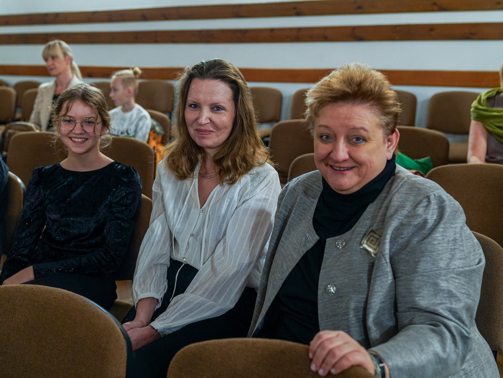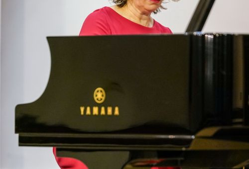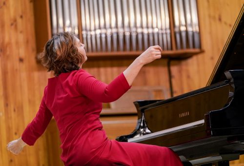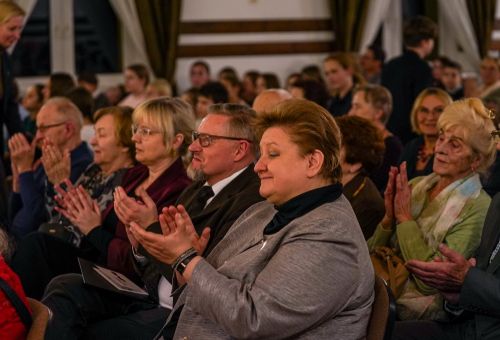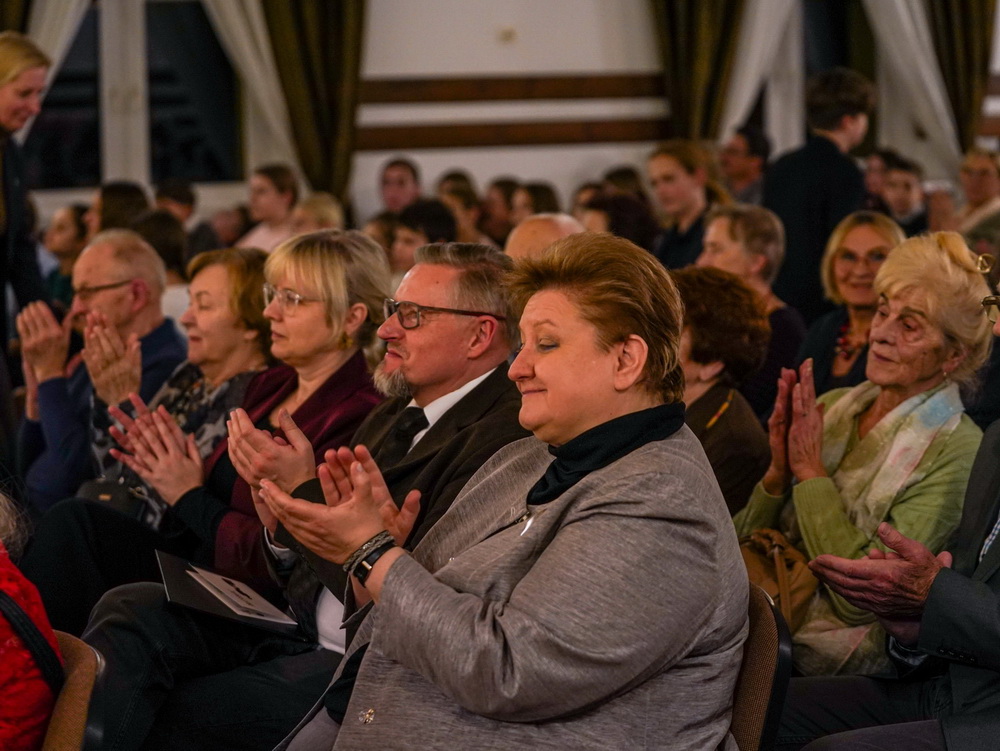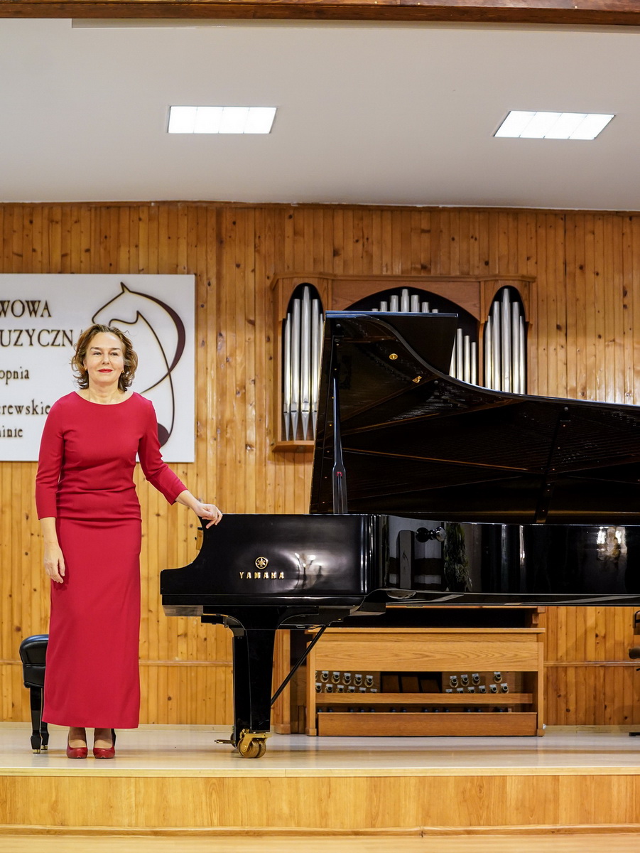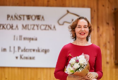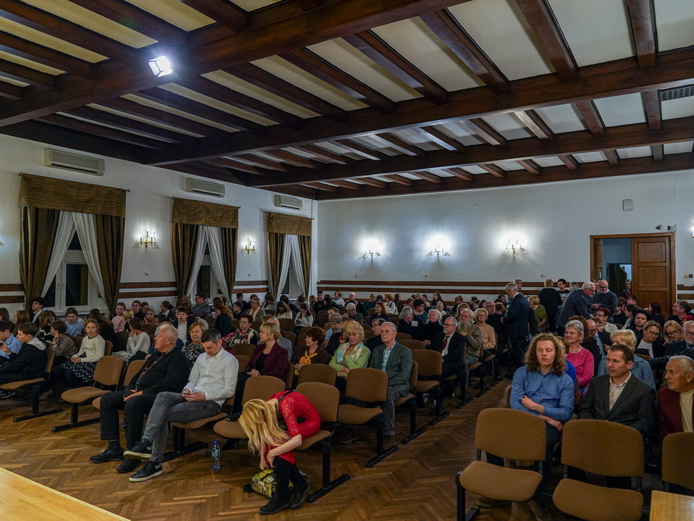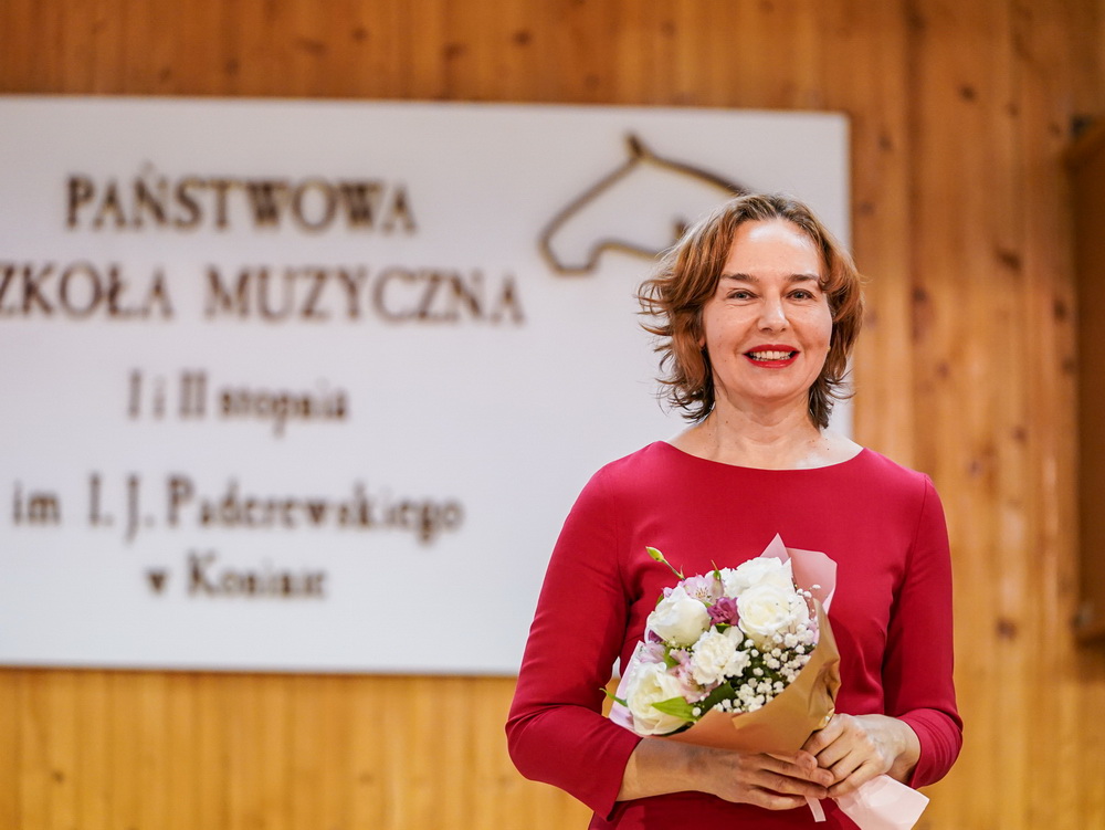 W galerii widać salę koncertową PSM w Koninie, siedzącą na krzesłach publiczność oraz koncertującą prof. dr hab. Magdalenę Lisak.