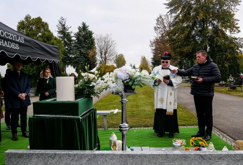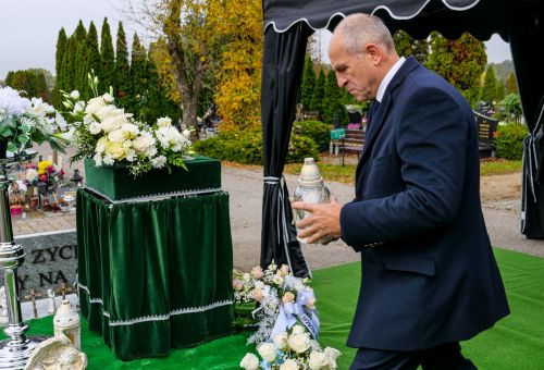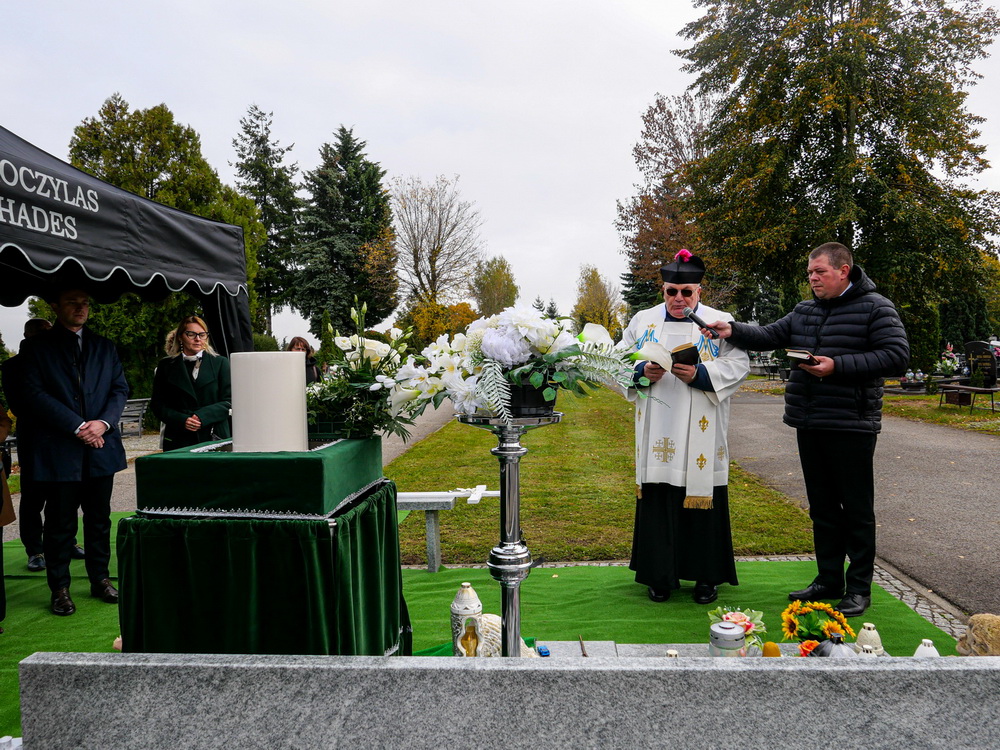 Na zdjęciach widać idący kondukt żałobny, uczestników uroczystości. Przed pomnikiem widać księdza odprawiającego nabożeństwo, stojących pod namiotem przed mogiłą żałobników. W centralnym miejscu umieszczono białą urnę udekorowaną białymi kwiatami.