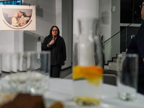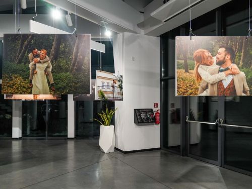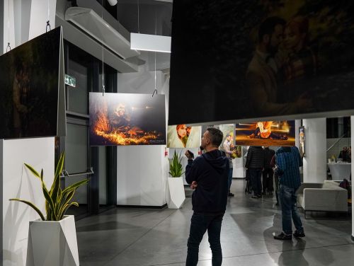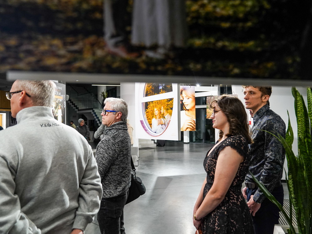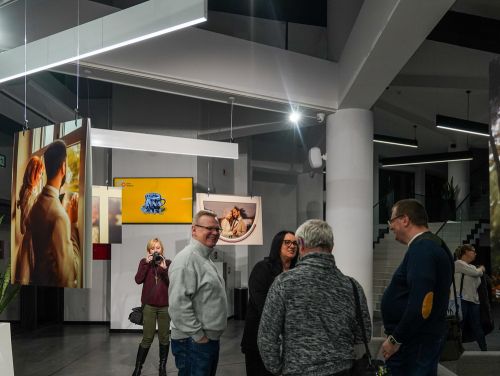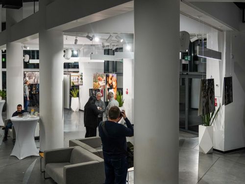 Na zdjęciach widać - hol Oskardu, w którym wyeksponowano wielkoformatowe zdjęcia. Są też ludzie uczestniczący w wernisażu prac.