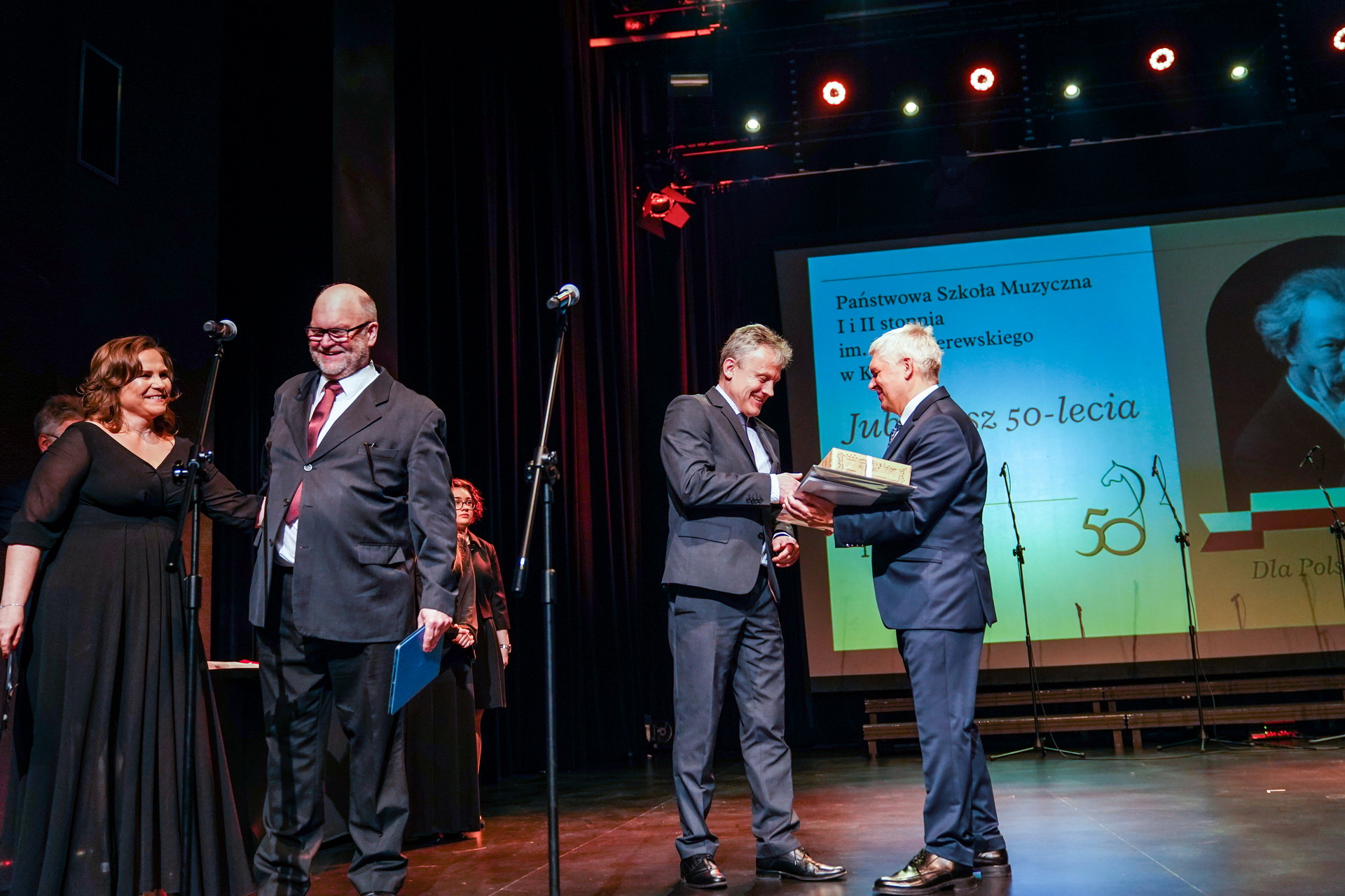 Po części oficjalnej oskardową scena zawładnęli mali i duzi muzycy, w małych i dużych formacjach, z orkiestrą symfoniczną włącznie. W czasie koncertu odbyła się prapremiera utworu skomponowanego specjalnie na 50-lecie szkoły przez światowej sławy kompozytora Dariusza Przybylskiego, absolwenta szkoły. Rewelacyjnie wypadły także tancerki z Konińskiego Teatru Tańca. Prowadzące KTT siostry d.d. Łapaj są absolwentkami „Muzyka”.