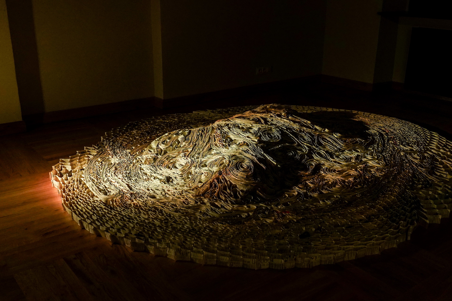 Wystawa prac Jagody Krajewskiej składa się z dwóch pokaźnych rozmiarów eksponatów. Artystka wykonała je z kart… starych książek telefonicznych, gdy miały one postać tzw. Yellow Page, czyli drukowane były na żółtych stronach. Jak sama mówi stworzyła obiekty, dzięki którym, za dotknięciem „czarodziejskiej różdżki” może swobodnie przemieszczać się po świecie dotykając którejkolwiek ze stron.