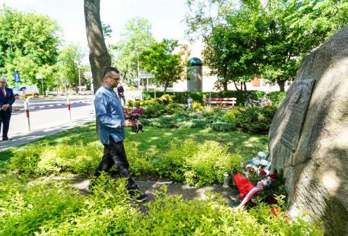 Kwiaty przed obeliskiem złożyli – w imieniu władz miasta – sekretarz Rafał Duchniewski oraz kierownik Wydziału Kultury i Sportu Zena Sroczyńska, w imieniu społeczności Szkoły Podstawowej nr 11 dyrektor Małgorzata Łechtańska, a także radni, mieszkańcy, przedstawiciele stowarzyszeń i organizacji.