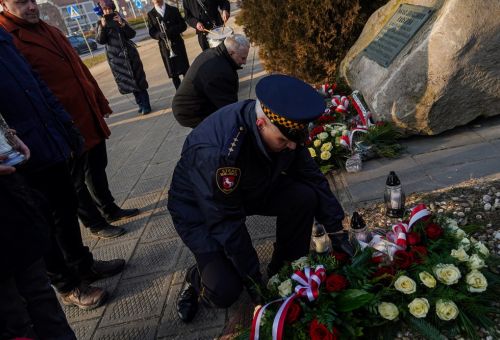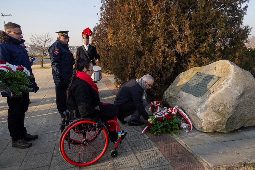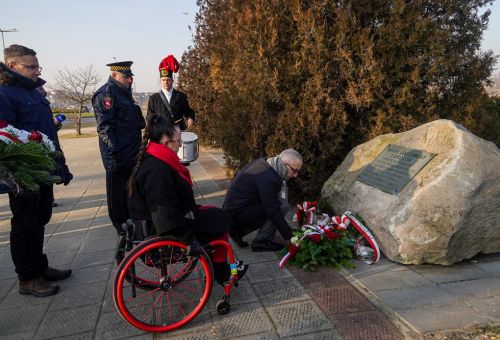 Na zdjęciach widać ludzi zebranych na Wale Tarejwy przed głazami, a także już podczas składania kwiatów przy obu obeliskach.