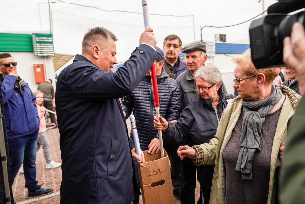 Wśród osób, które pojawiły się na miejski targowisku i otrzymały flagi byli m.in. poseł Leszek Galemba czy radny wojewódzki Robert Popkowski.