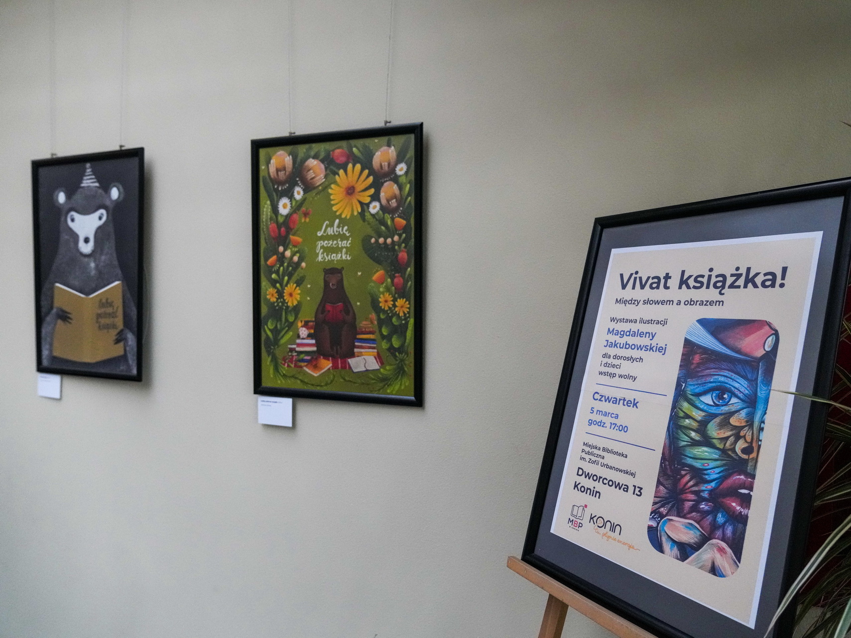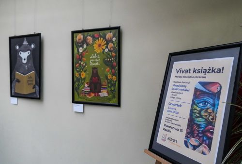Zdjęcia przedstawiają prace Magdaleny Jakubowskiej oraz książki zilustrowane przez nią, prosto z bibliotecznego księgozbioru