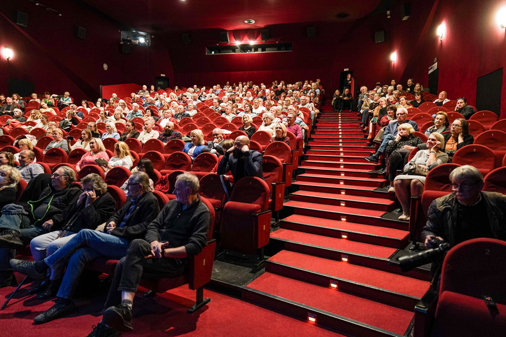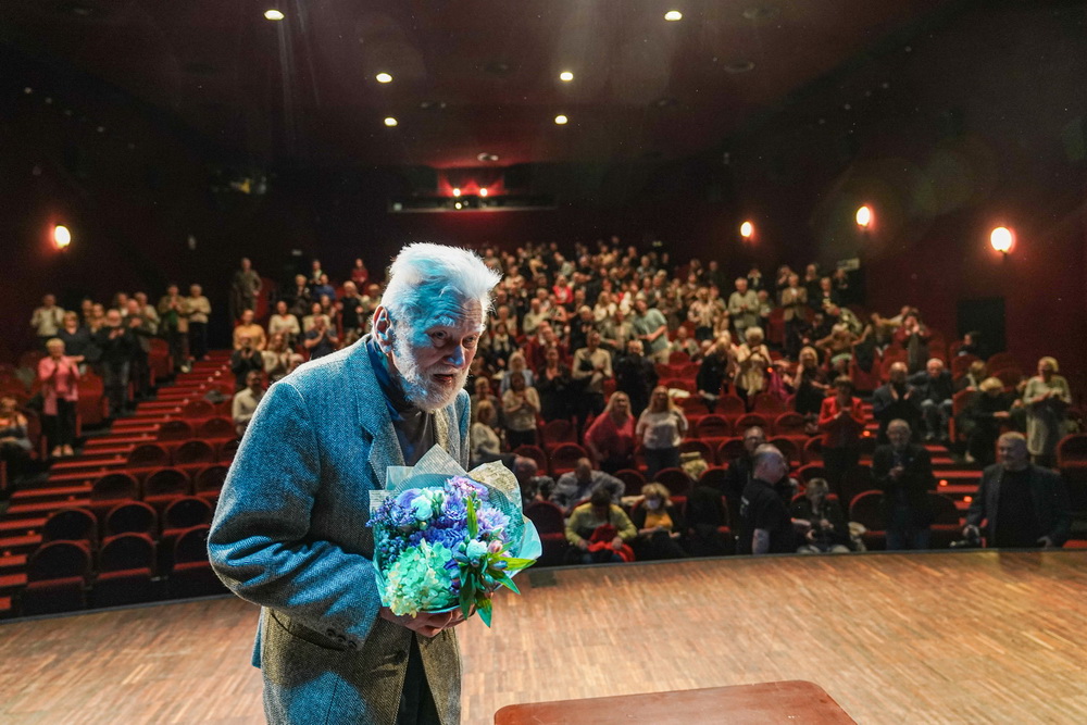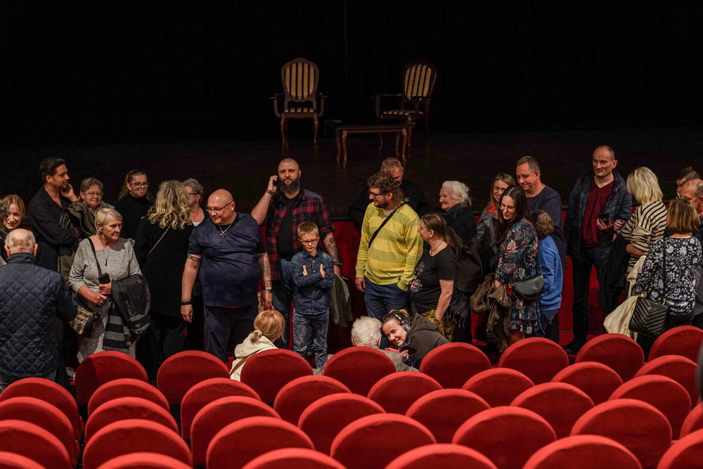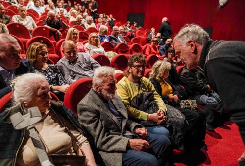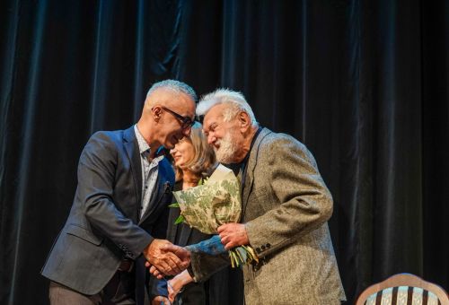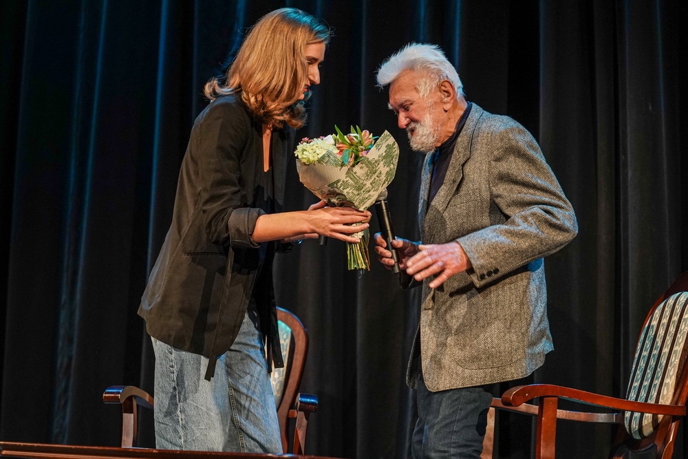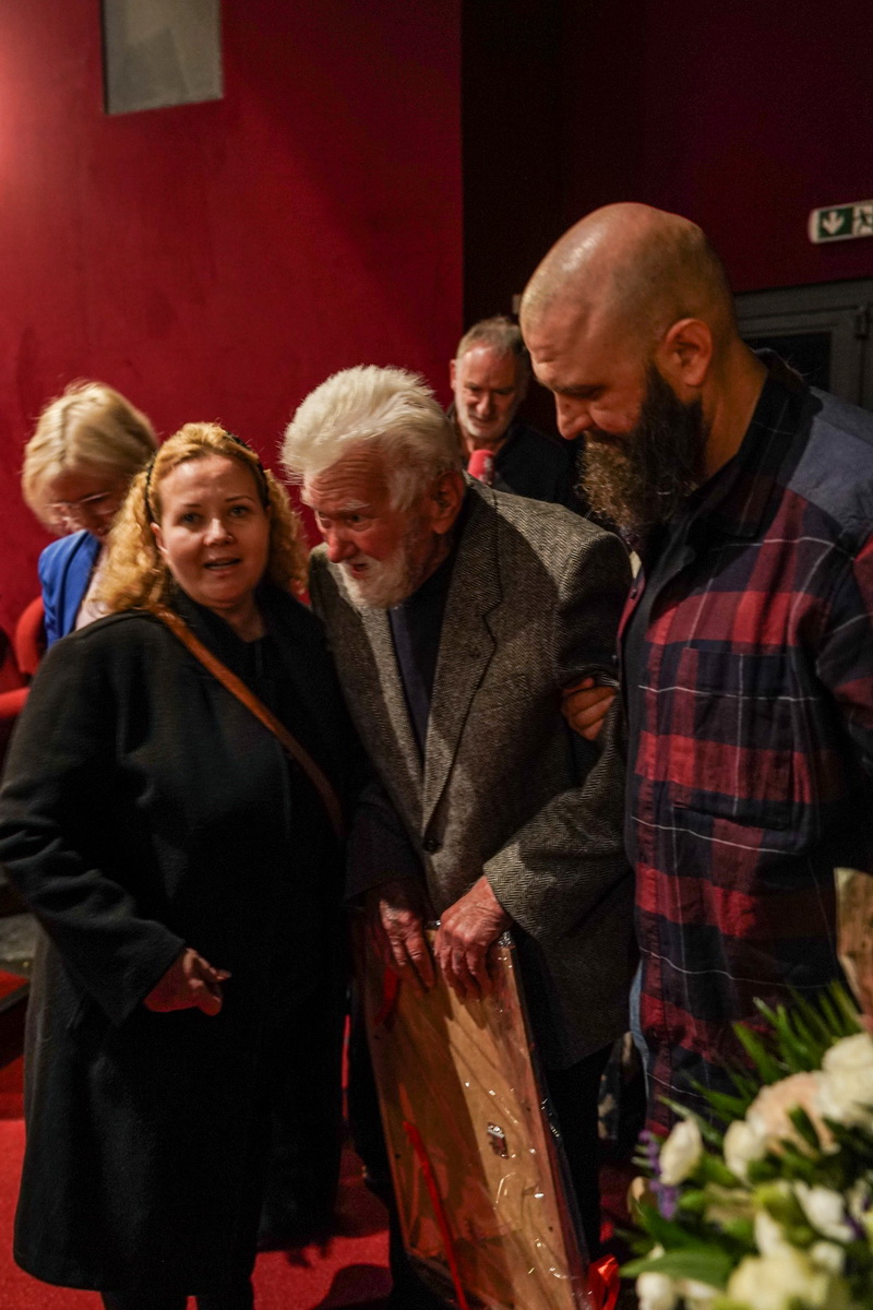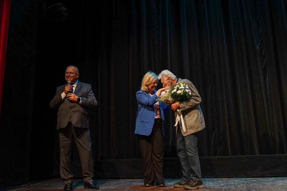 Zdjęcia przedstawiają widownie w KCK, Jana Sznajdra siedzącego na fotelu widowni i na scenie podczas rozmowy po filmie, widać kadry z filmu i osoby składające życzenia bohaterowi.