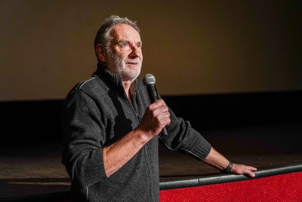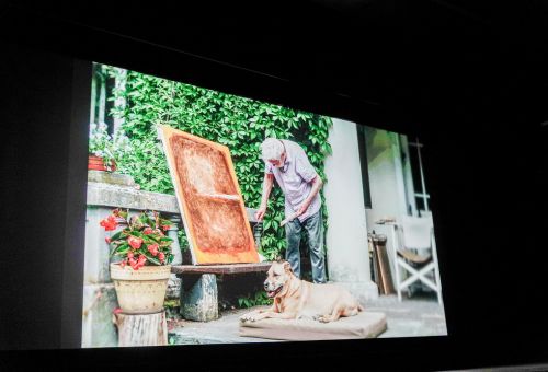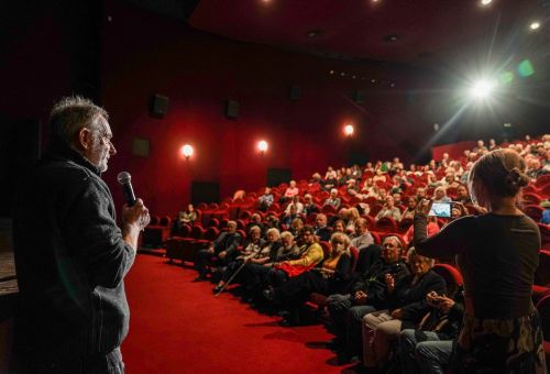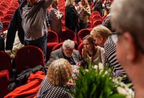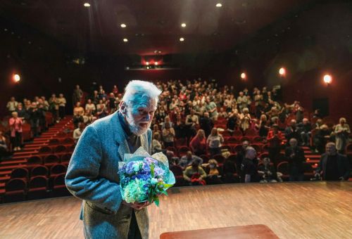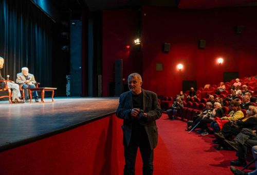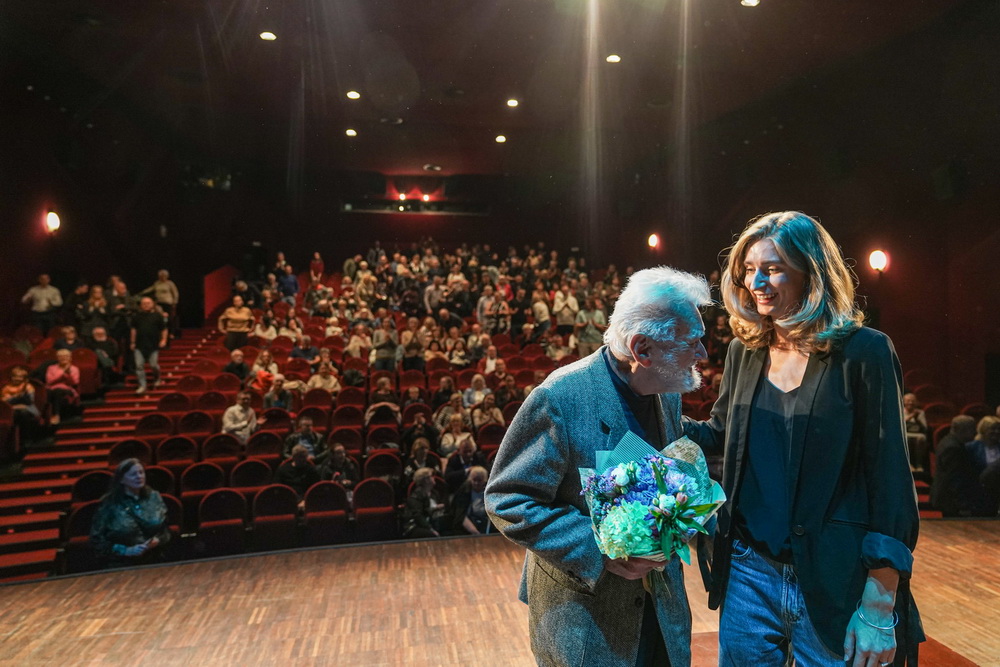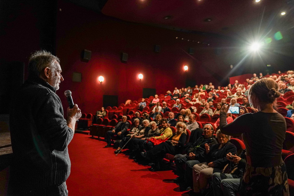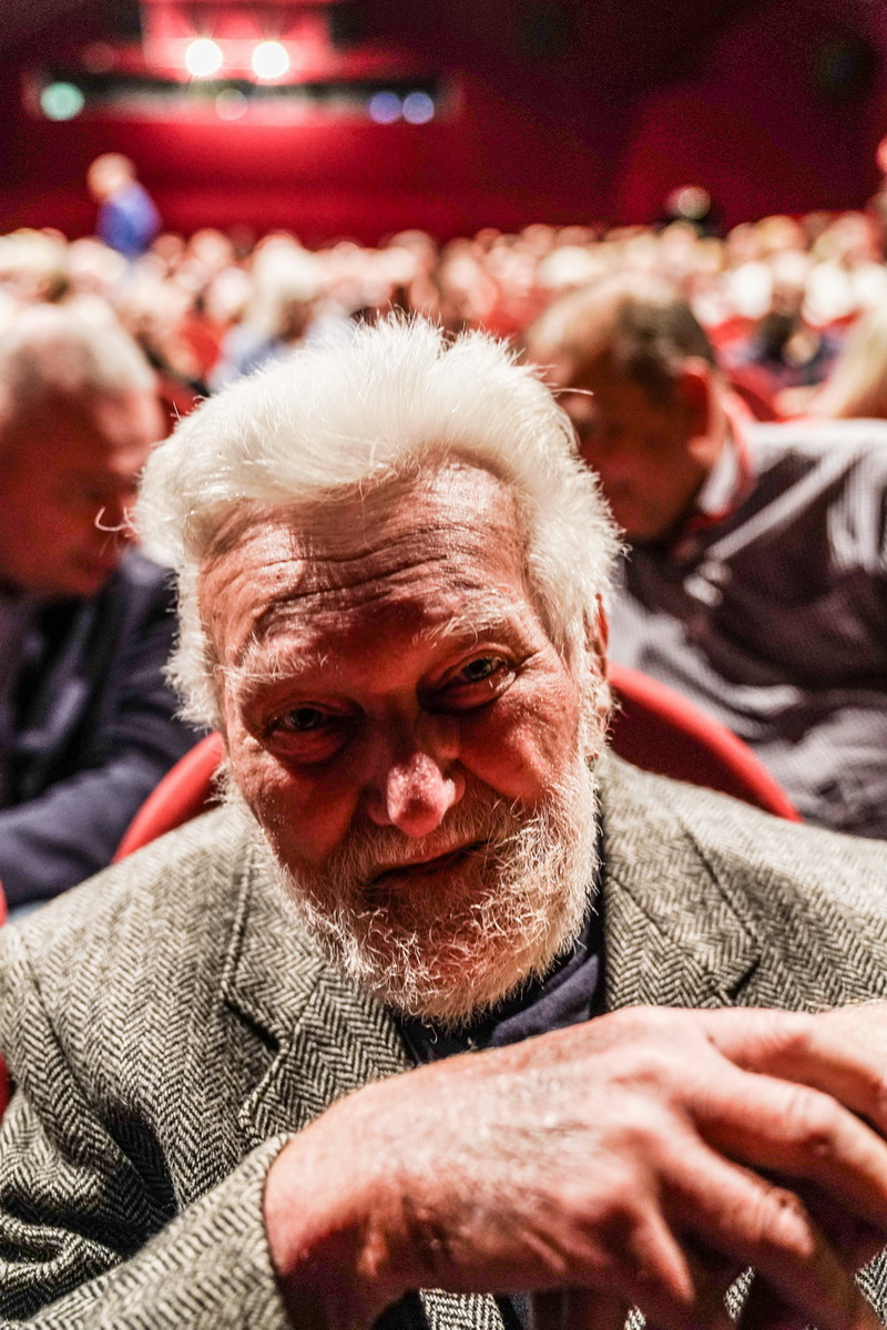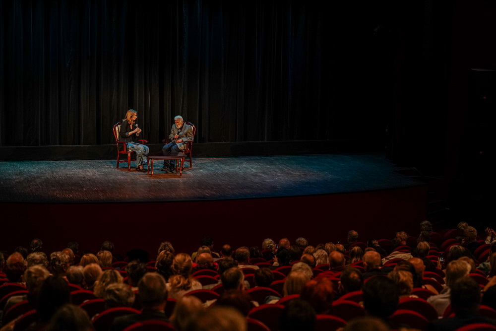Zdjęcia przedstawiają widownie w KCK, Jana Sznajdra siedzącego na fotelu widowni i na scenie podczas rozmowy po filmie, widać kadry z filmu i osoby składające życzenia bohaterowi.