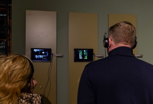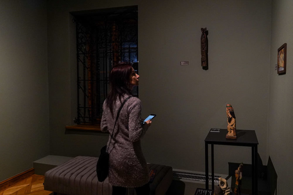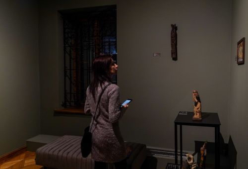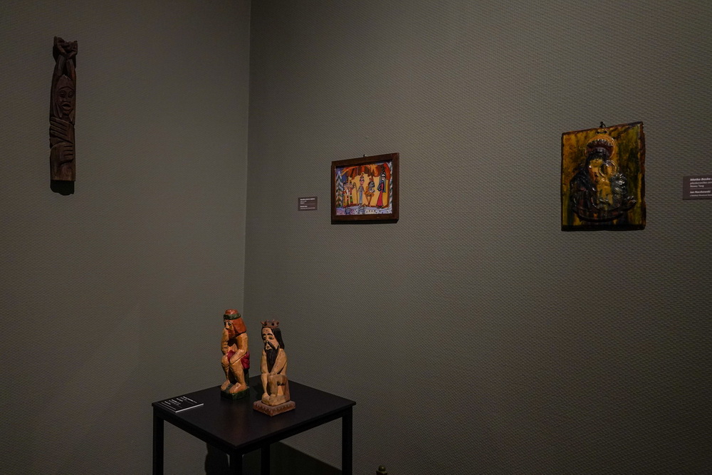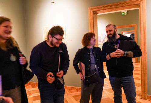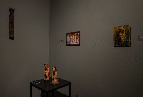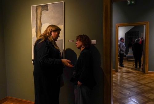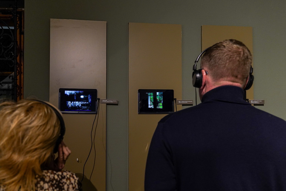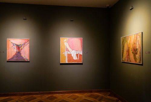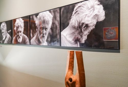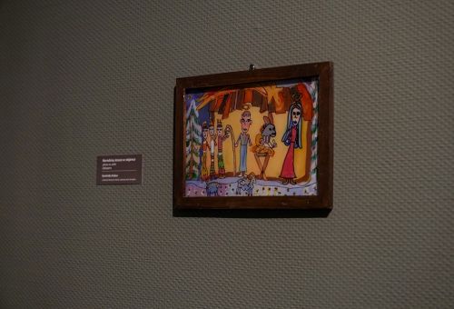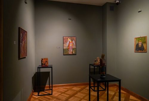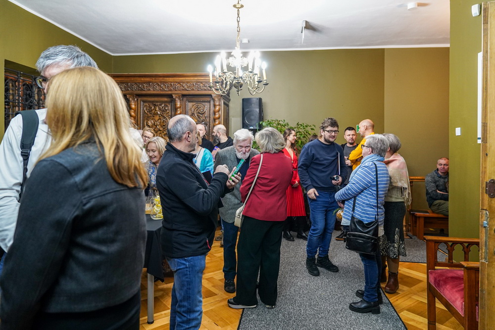 Na zdjęciach widać artystę Jana Sznajdra, jego gości podczas wernisażu prac w zamku w Gosławicach. Są też zbliżenia jego obrazów, rzeźb i pamiątek w gablotach.