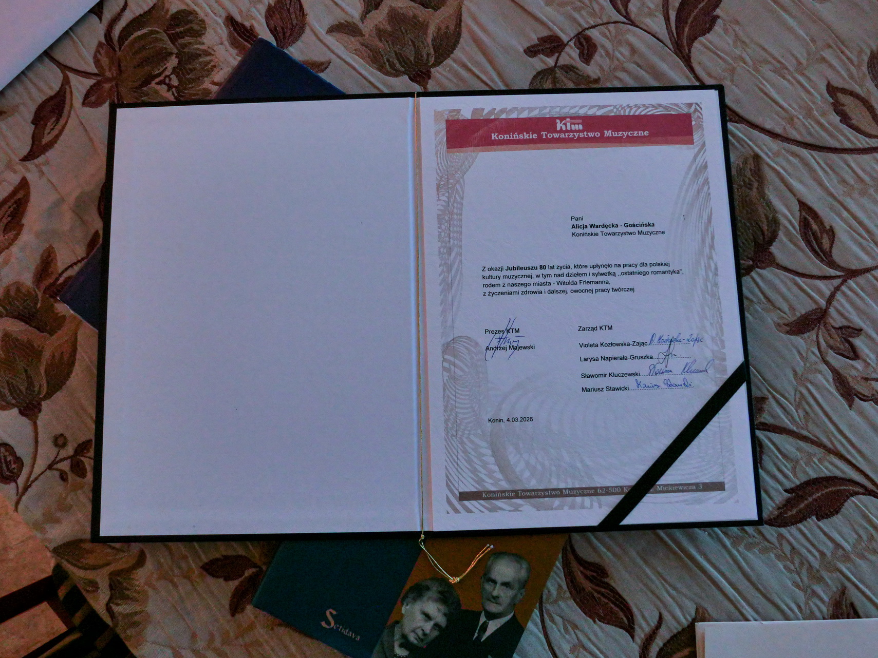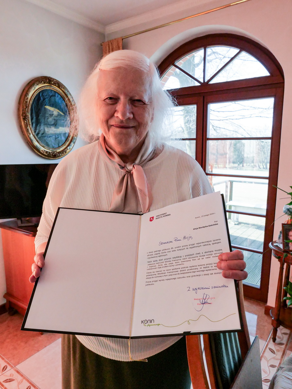 Specjalny list gratulacyjny z serdecznymi życzeniami wystosował prezydent Konina Piotr Korytkowski. Nie zabrakło także życzeń od społeczności najstarszej konińskiej instytucji kultury Konińskiego Towarzystwa Muzycznego. Nauczyciele i uczniowie także uczcili urodziny swojej wieloletniej koleżanki i pani profesor – przybyli nie tylko z tortem, ale i… orkiestrą dętą. Niezwykle radośnie jubilatka przyjęła delegację MBP im. Z. Urbanowskiej, której dyrektor Daniel Kruczkowski przekazał na jej ręce świeżo wydrukowany przez Wydawnictwo Setidava drugi tom korespondencji Friemanna. Jubilatka bardzo dziękuje wszystkim za pamięć i życzenia. Jednocześnie przyznała, że pracuje nad kolejnymi wydawnictwami związanymi nie tylko z życiem wielkiego kompozytora pochodzącego z Konina.