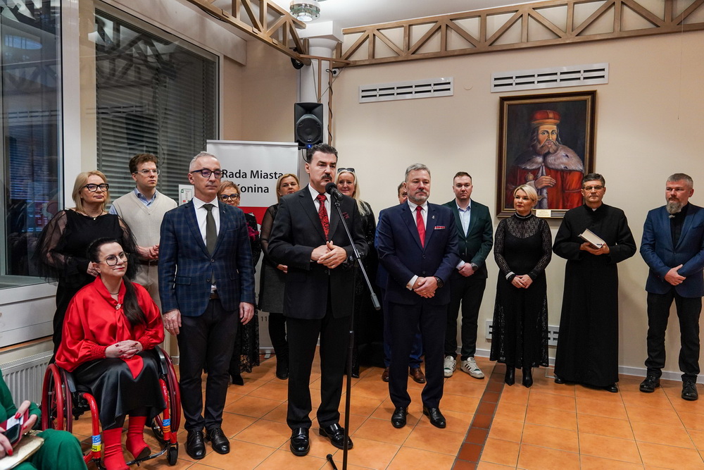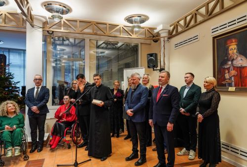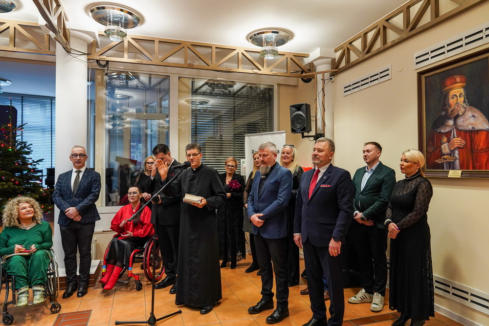 W galerii są zdjęcia pokazujące uczestników spotkania w ratuszu. Widać gości, gospodarzy uroczystości podczas przemówień, a także moment dzielenia się opłatkiem i składania życzeń.