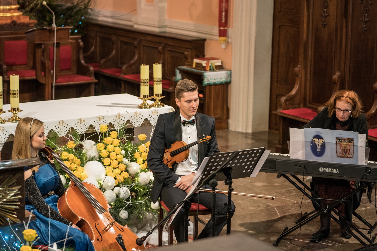 Koncert zatytułowany był „Wigilia w muzyce i poezji”. Jego scenariusz napisała Danuta Dudzińska, znakomita sopranistka z Teatru Wielkiego w Łodzi. Towarzyszyli jej, w ten bardzo rodzinny świąteczny czas najbliżsi - córka, zięć i serdeczna przyjaciółka Iwona Jakubowska – piano, Justyna Jakubowska – wiolonczela oraz Piotr Jakubowski – skrzypce. Ale ku zaskoczeniu licznie zebranych słuchaczy przepiękne wiersze z klasyki polskiej poezji recytowali (od razu trzeba dodać, że czynili to znakomicie) - red. Anna Wysocka, szefowa tygodnika „Adalbertus” i ks. Paweł Śmigiel, którzy już od 11 lat organizują i prowadzą koncerty z nietypowego w skali kraju projektu. Nie zabrakło wspólnego śpiewania kolęd i bardzo serdecznych braw.