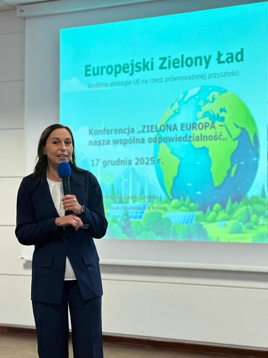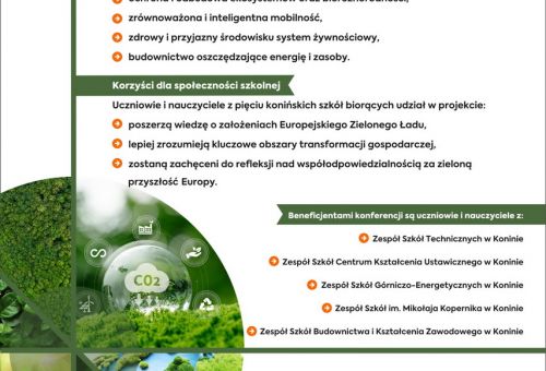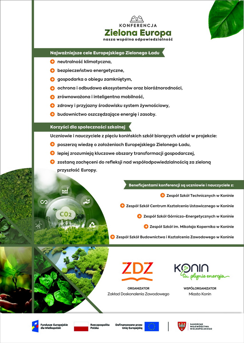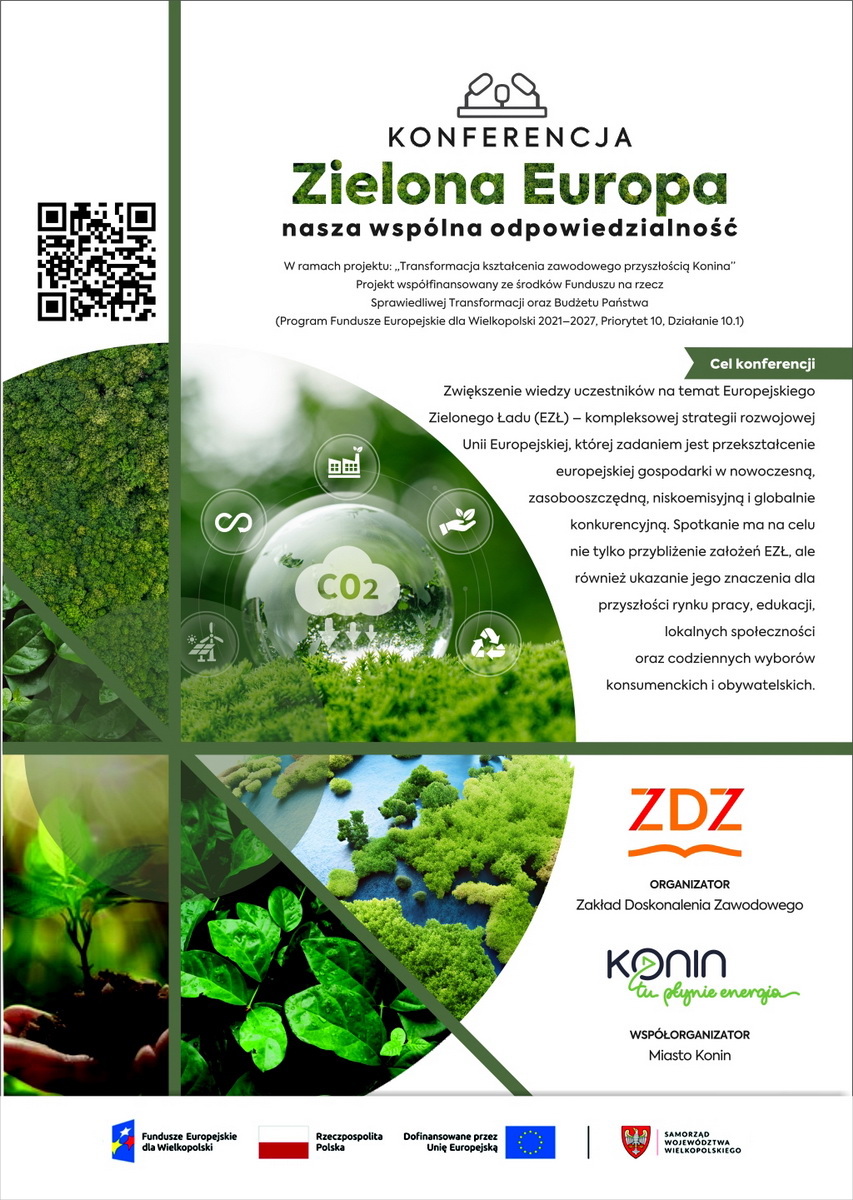 W dniu 17 grudnia 2025r. odbyła się Konferencja „Zielona Europa – nasza wspólna odpowiedzialność” w ramach projektu: „Transformacja kształcenia zawodowego przyszłością Konina” współfinansowanego ze środków Funduszu na rzecz Sprawiedliwej Transformacji oraz Budżetu Państwa (Program Fundusze Europejskie dla Wielkopolski 2021–2027, Priorytet 10, Działanie 10.1)