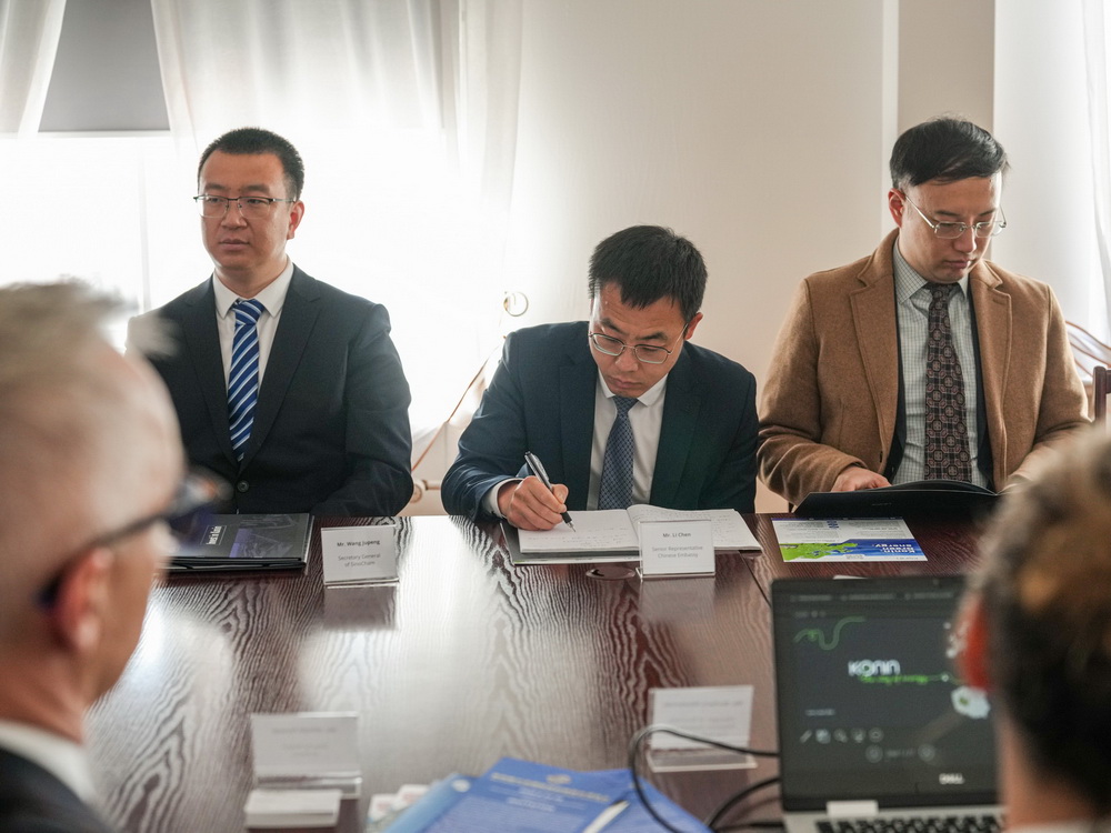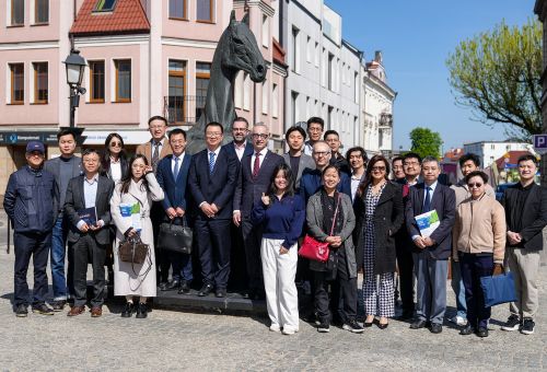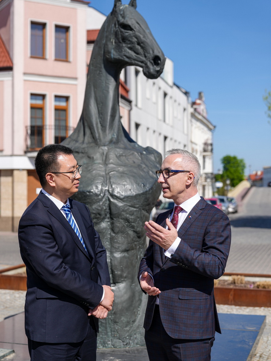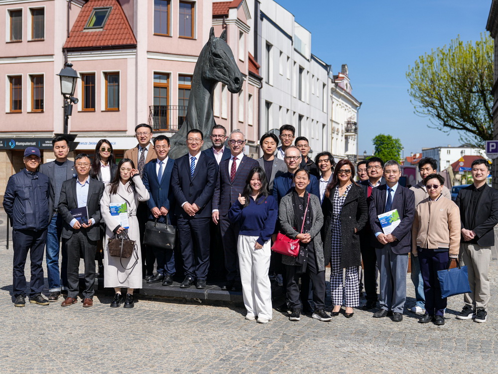 Na zdjęciach widać delegację z Chin siedzącą przy stole w sali konferencyjnej, przedstawicieli strony polskiej i chińskiej występujących przed zebranymi, a także wspólne zdjęcia na rynku przy rzeźbie konia.