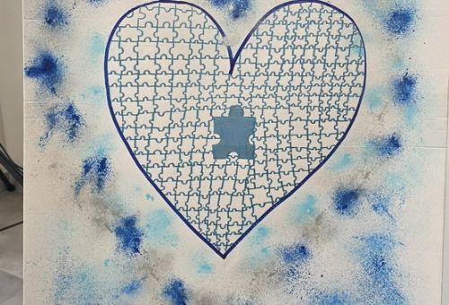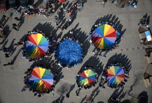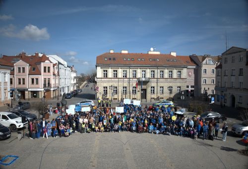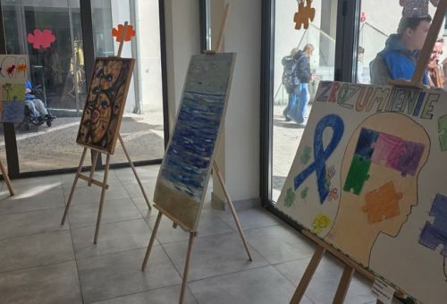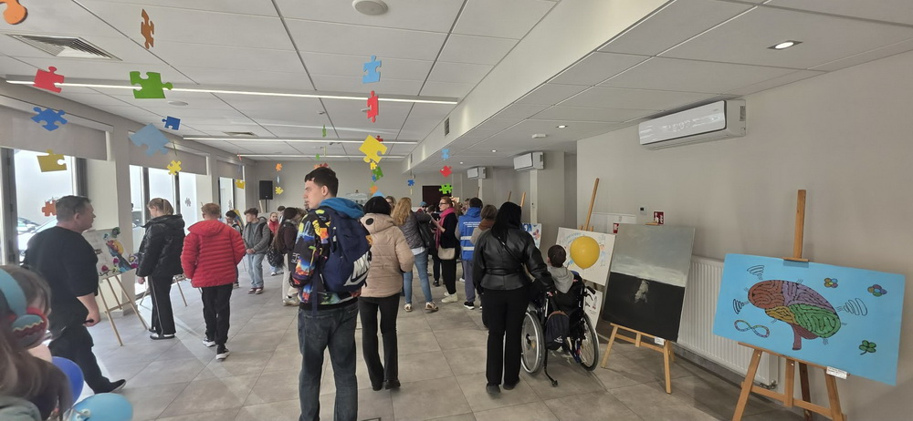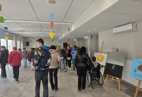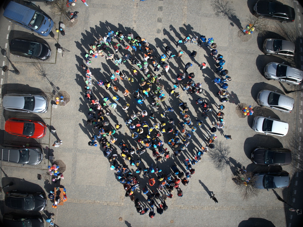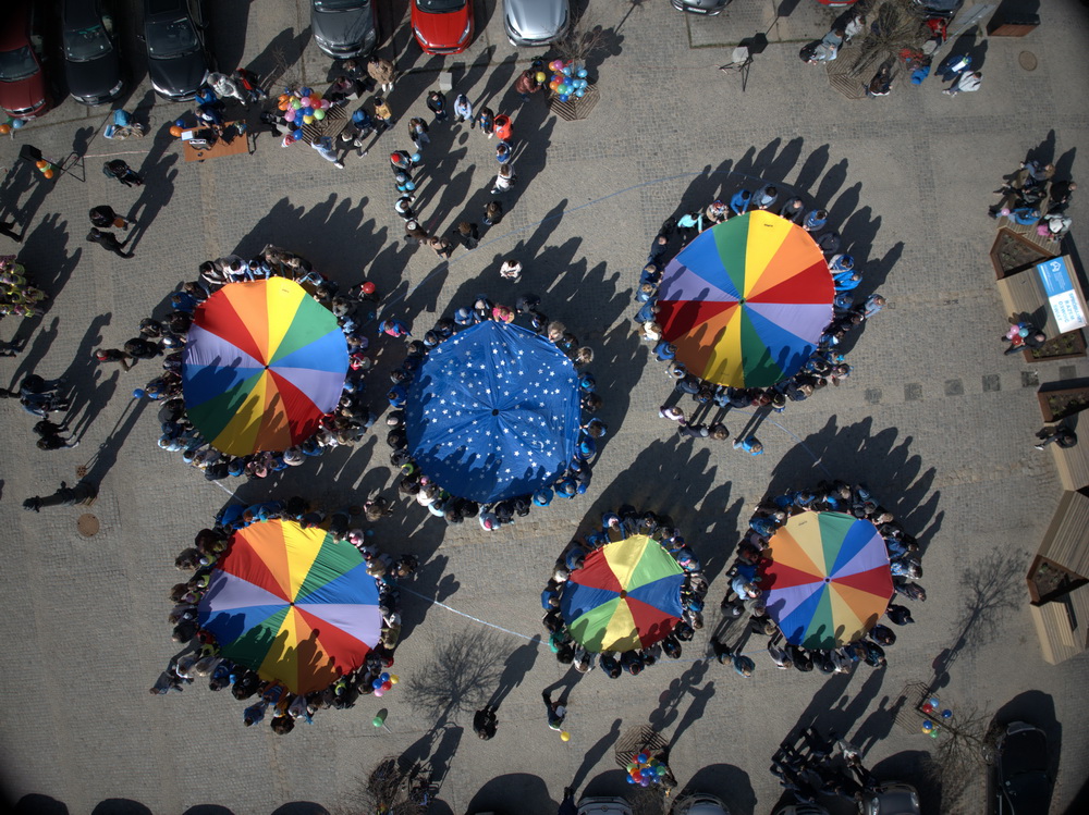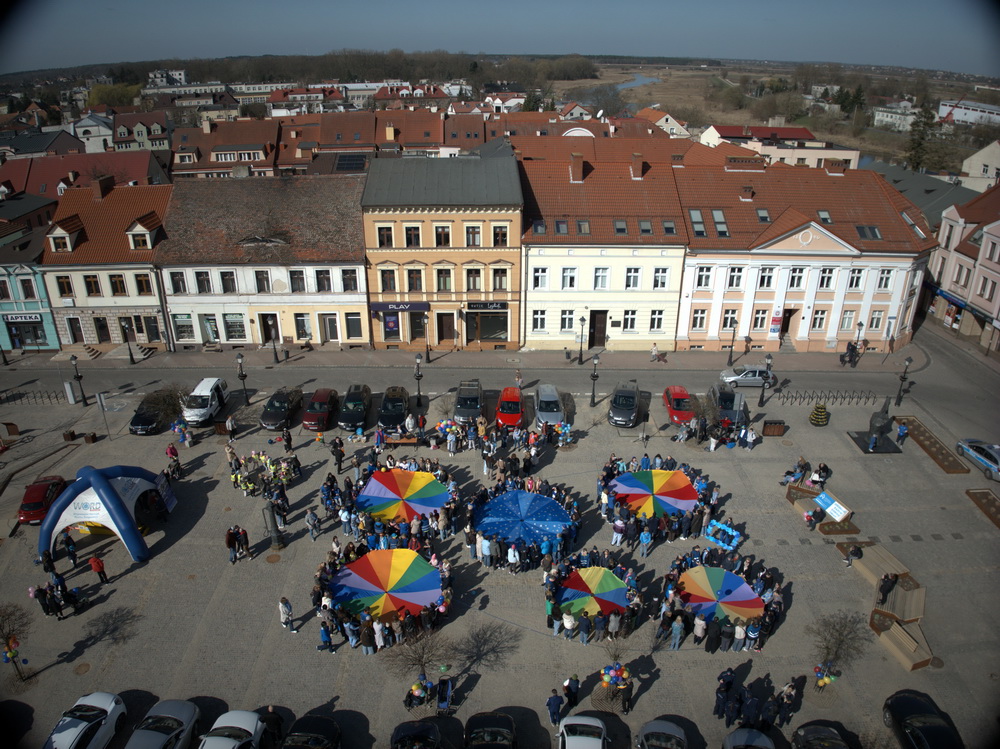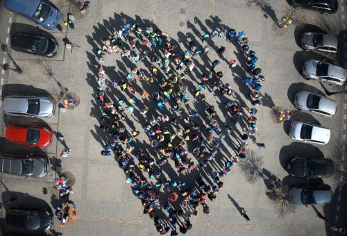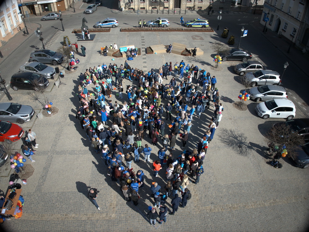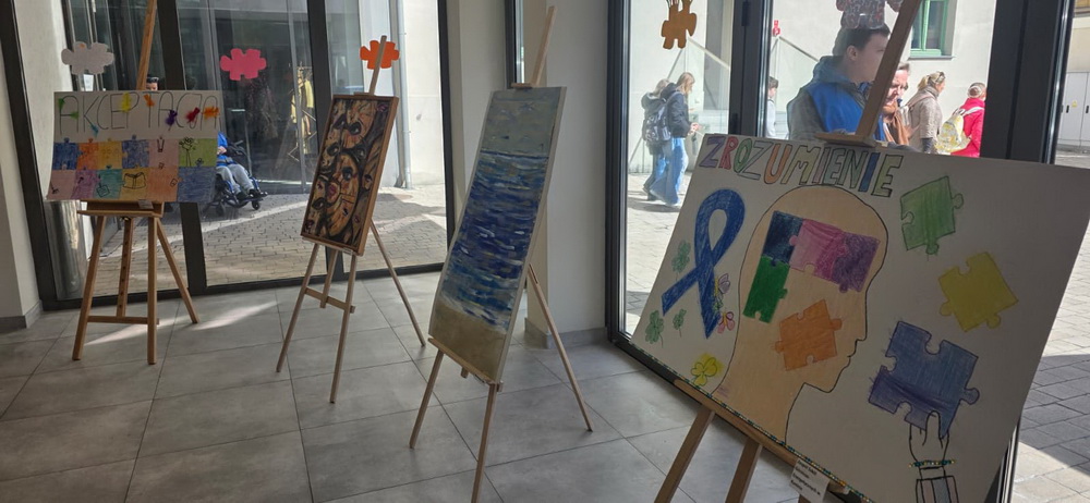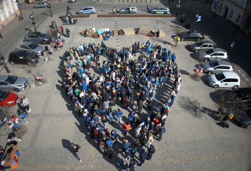 Na zdjęciach widać wystawę prac dotyczących autyzmu, które są wystawiane na holu Domu Zemełki. Widać też happening, który odbywał się na miejskim rynku - zdjęcia z drona pokazują serduszko utworzone przez ludzi oraz kolorowe chusty.