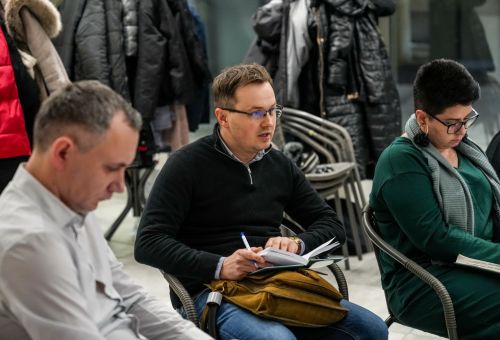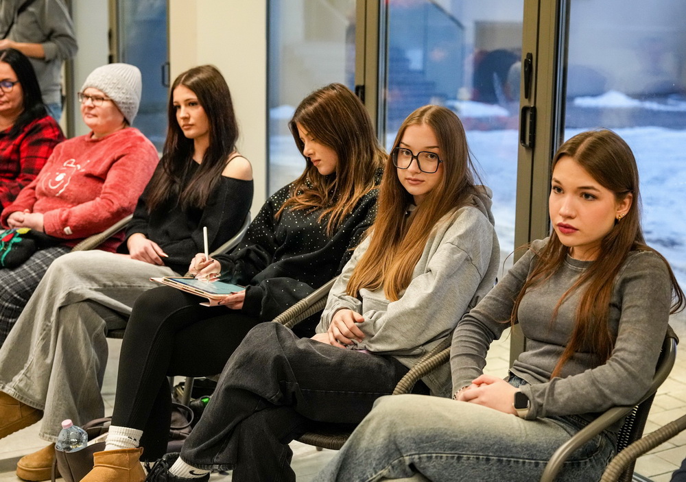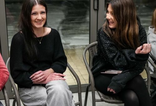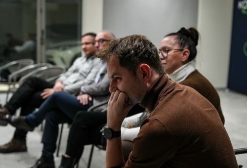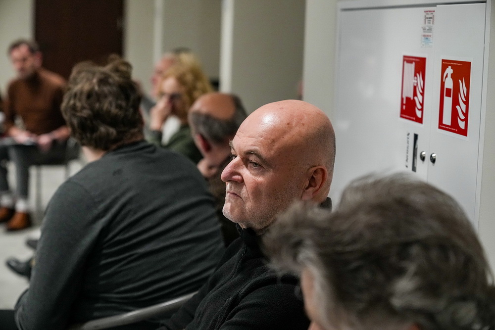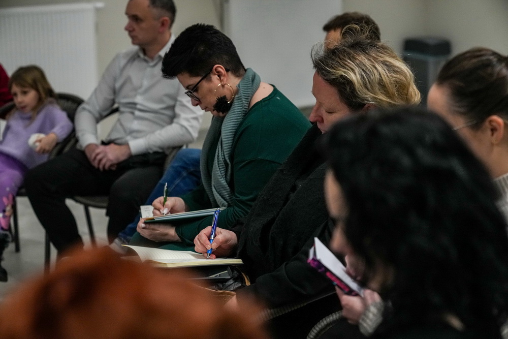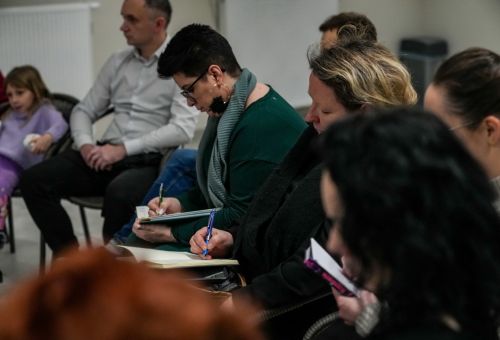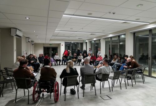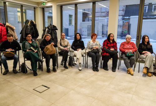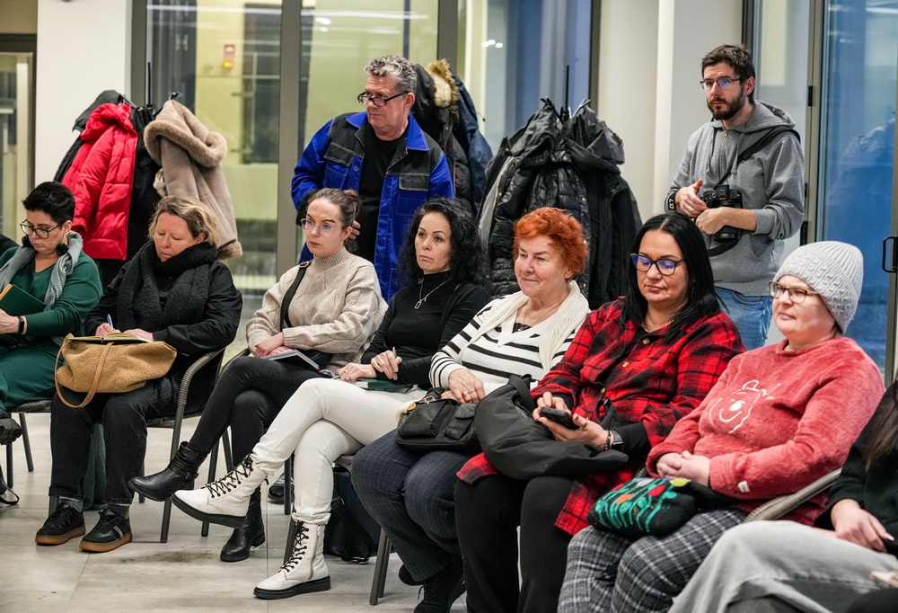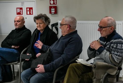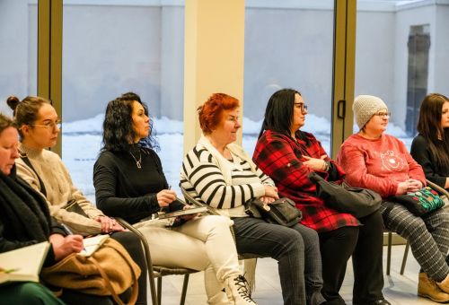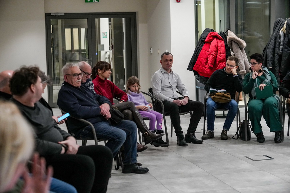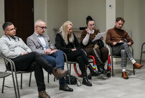 Na zdjęciach widać ludzi siedzących na krzesłach ustawionych w okrąg w sali Domu Zemełki.