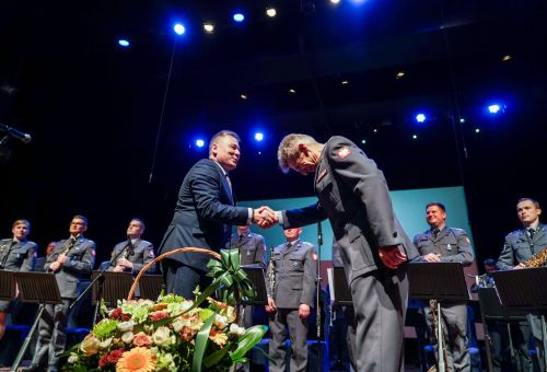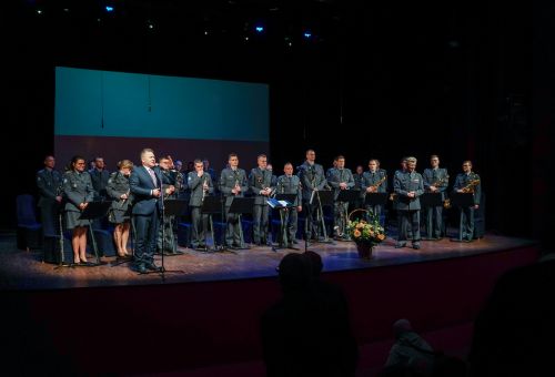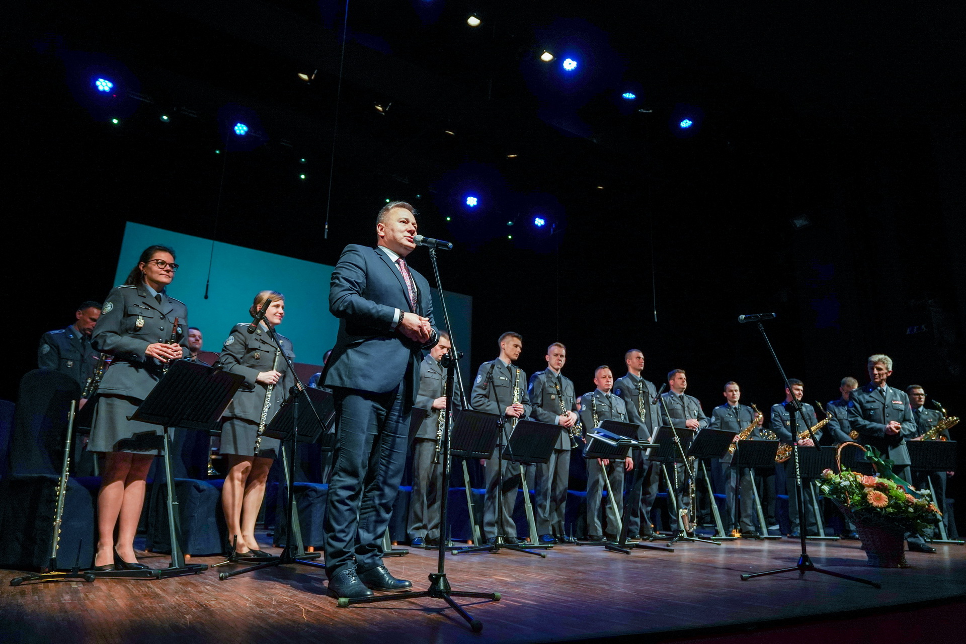 Nie obyło się bez wspólnych śpiewów i specjalnej pieśni zaśpiewanej – jak to ujął dyrygent – „…naszym gościom z Ukrainy…”. Było też „Sto lat” zaintonowane i dyrygowane przez prezydenta Konina Piotra Korytkowskiego, który przypomniał, że niebawem zespół reprezentacyjny lotników obchodził będzie kolejne urodziny. Prezydent Konina, który zaprosił mieszkańców na „Majówkę z Orkiestrą” podziękował serdecznie muzykom i zdradził, że jest z ich dyrygentem „po słowie” w sprawie koncertu noworocznego.