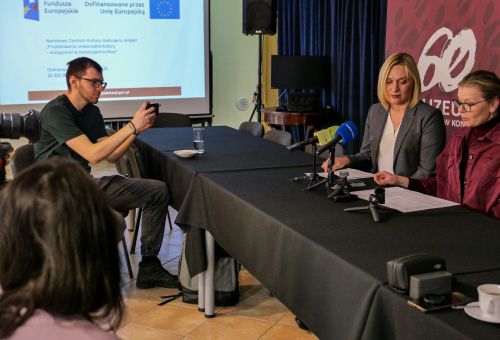 Zdjęcia przestawiają konferencje prasową zorganizowaną przez Muzeum Okręgowe w Koninie na temat realizacji projektu, który ułatwi dostępność osobom niepełnosprawnym i starszym do prezentowanych wystaw.