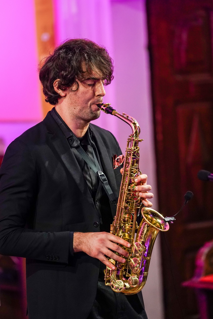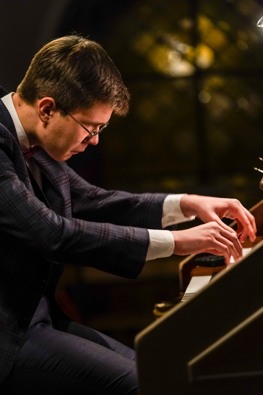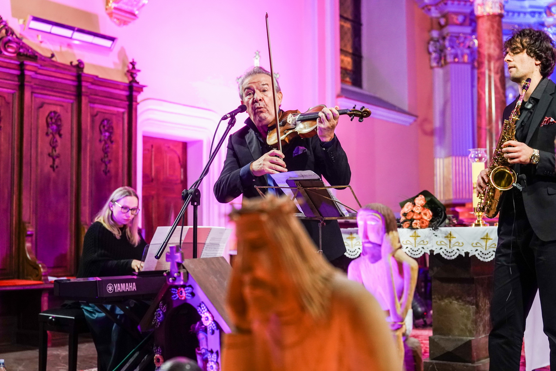 I wreszcie dzień finałowy. Tu nie było żadnych wątpliwości, że przyjdzie nam obcować z muzyką przez największe „M”. Do Konina bowiem „powrócił” Vadim Brodski, światowej sławy skrzypek, dzięki któremu nieliczni z nas posiadają niezwykłą płytę, którą na ponad stuletnich organach św. Wojciecha nagrał wraz z prof. Romanem Peruckim. I tym razem nie przybył sam. Namówił swojego syna Juliana, saksofonistę, by ten zrezygnował na chwilę z trasy koncertowej w Chinach i przyleciał do Konina. Wraz z obu panami wystąpiła czarująca – pod tak licznymi względami, że aż trudno wymienić je w jednym zdaniu – pianistka Katarzyna Nowaczewska-Manthey. I jakby tego było mało Maestro zaprosił do wspólnego koncertowania zaledwie 16-letniego konińskiego organistę, ucznia naszego „Muzyka”, opromienionego już licznymi nagrodami i koncertami w wielu sławnych miejscach Maksymiliana Tomczaka. Razem wykonali „Ave Maryia”. Vadim Brodski, nim zabrzmiały ich wspólne nuty, bardzo ciepło wyrażał się o młodym koninianinie, wieszcząc mu znakomita przyszłość i doradzając by obok organistyki zaczął studiować… stosunki międzynarodowe „…a na pewno zostanie w przyszłości ministrem spraw zagranicznych…”.