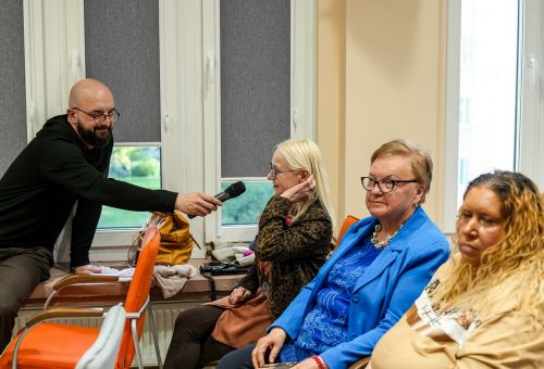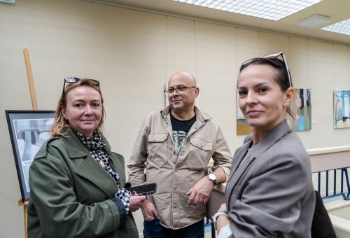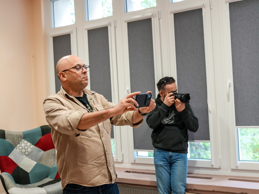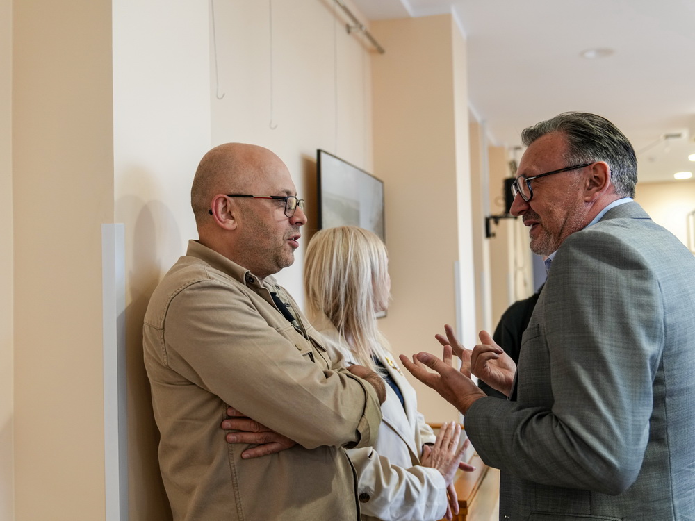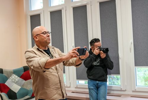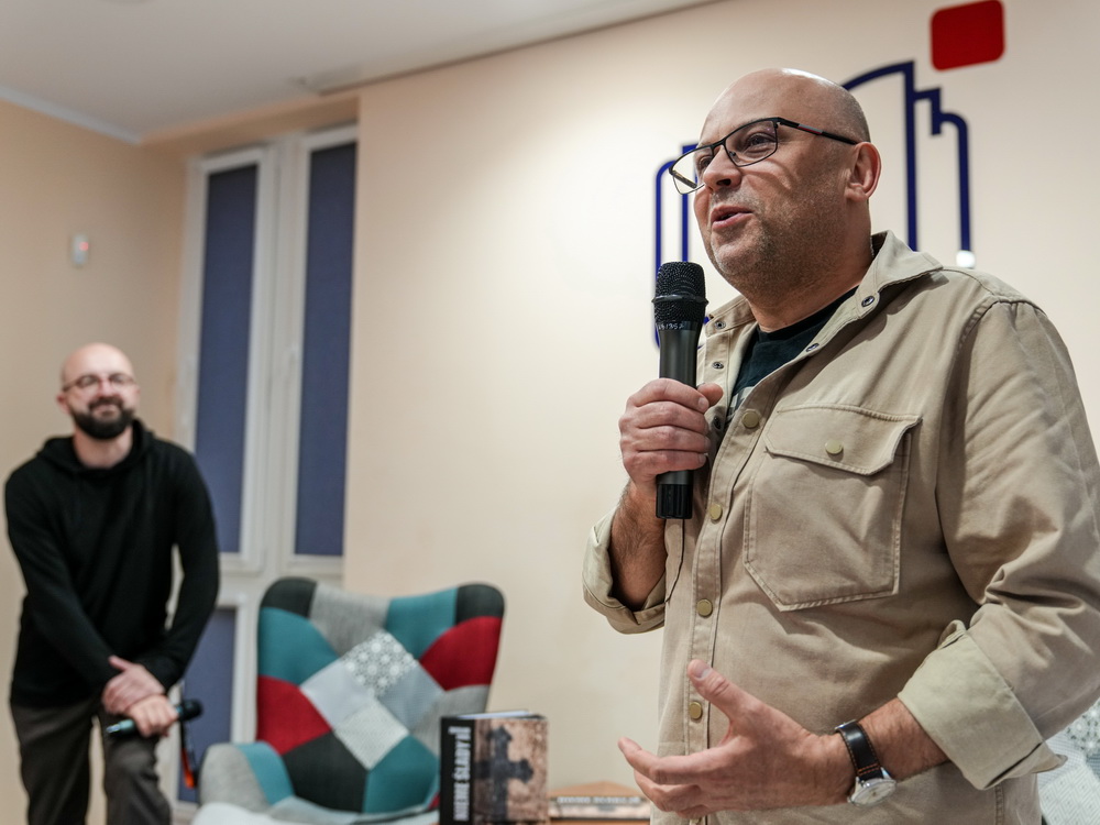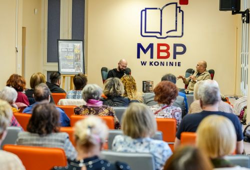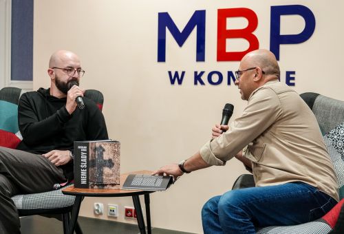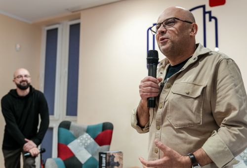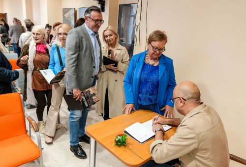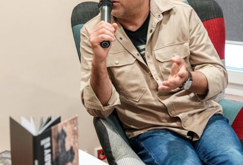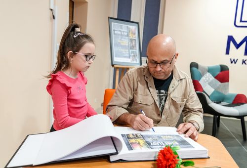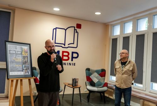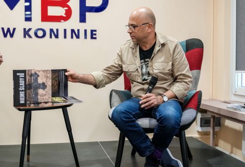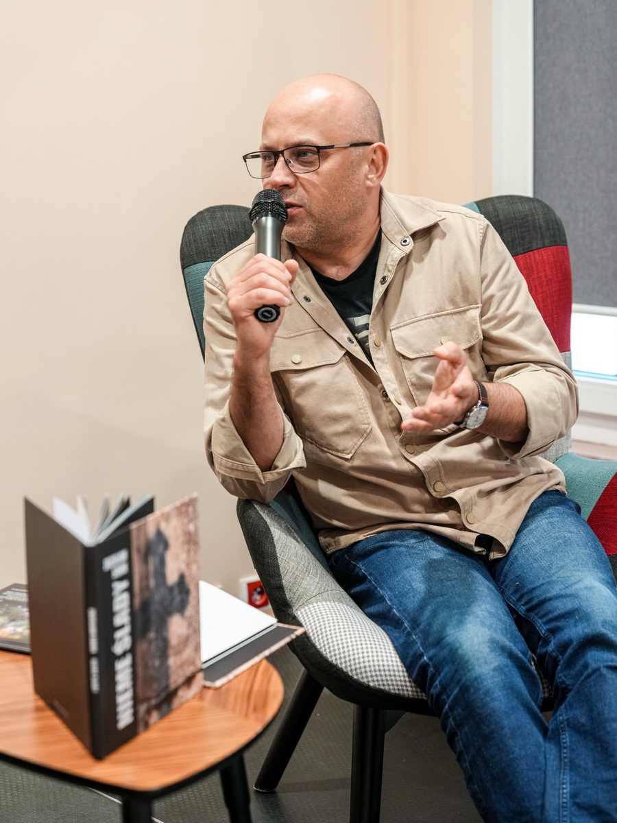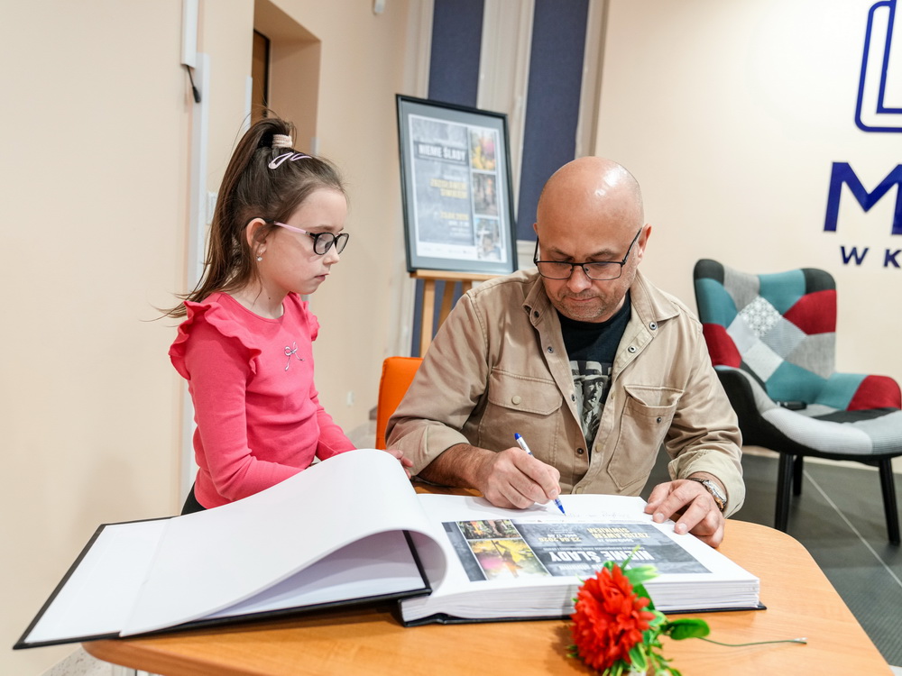Na zdjęciach widać autora najpierw rozmawiającego z gośćmi spotkania, później już podczas opowieści o pracy, a na końcu podpisującego albumy.