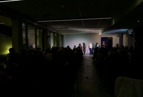 Galeria zdjęć to obrazki z przedstawienia. W zaciemnionej sali widać publiczność, aktorów - grających w miejscu zaaranżowanej sceny lub siedzących przy stole, a także zaproszonych gości.