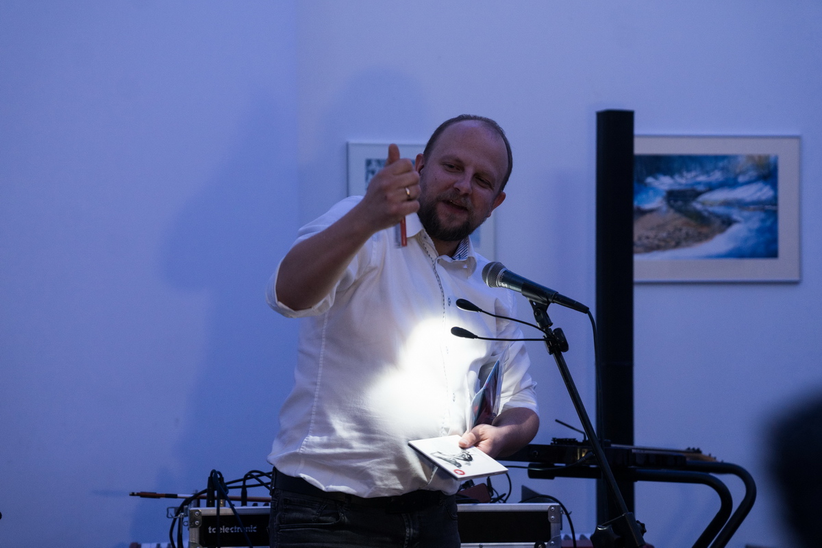 Tego wieczoru okazało się, że „wieżowa sala koncertowa” nie jest już najmniejszą w kraju. Łukasz Pawlak bowiem organizuje koncerty tylko dla... 21 słuchaczy. Opowiadał o tym i o powstających w jego wytwórni płytach (tu też obowiązuje magiczna liczba 21), prezentował niecodzienne okładki wydawnictw. Od stylizowanych na opakowanie starej profesjonalnej taśmy używanej do nagrań w Polskim Radiu, przez kartonową kamienicę czy fragment muru z własnego domu, po... poduszkę.
