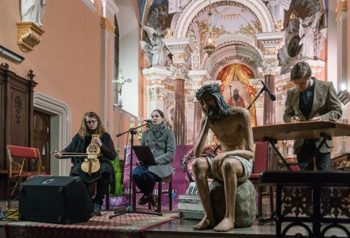 Kapela Fedaków z Katowic (Iga Fedak - śpiewa, uczy tańców i gra na barabanie oraz bębenku obręczowym, Karolina Fedak - gra na skrzypcach oraz suce biłgorajskiej, którą w znacznej mierze wykonała samodzielnie i Kuba Fedak – multiinstrumentalista, pedagog, gra na akordeonie, cymbałach oraz fujarkach, a także wibrafonie) wystąpiła w niedzielny wieczór (28 lutego) w kościele pw. św. Wojciecha. W programie zatytułowanym „Pieśni postne” artyści zaprezentowali fragment niezwykle bogatej kolekcji pieśni polskich na czas oczekiwania na największe święto chrześcijan.