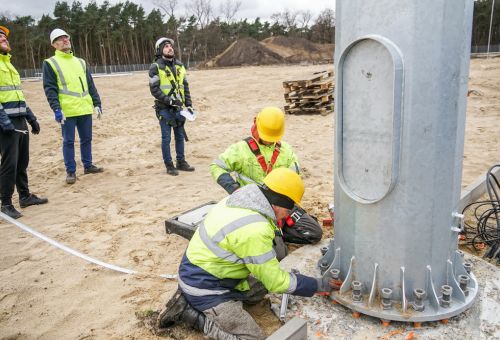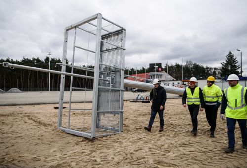 Na podesty masztów prowadzą systemowe rozwiązania komunikacji pionowej z asekuracją wyposażoną w mechanizm samozaciskowy blokujący upadek na odcinku 14 cm. Jak tłumaczą specjaliści - daje to możliwość rezygnacji z wymaganych przepisami obręczy ochronnych zabezpieczających przed upadkiem z wysokości w przypadku drabin od wysokości powyżej 3 m nad poziomem terenu. Producentem masztów jest Przedsiębiorstwo Produkcyjno-Usługowo-Handlowe ELMONTER OŚWIETLENIE z Zagórowa. Fundamenty w postaci studni zapuszczanych betonowano 29 grudnia ubiegłego roku, a więc beton uzyskał wymaganą pełną wytrzymałość.