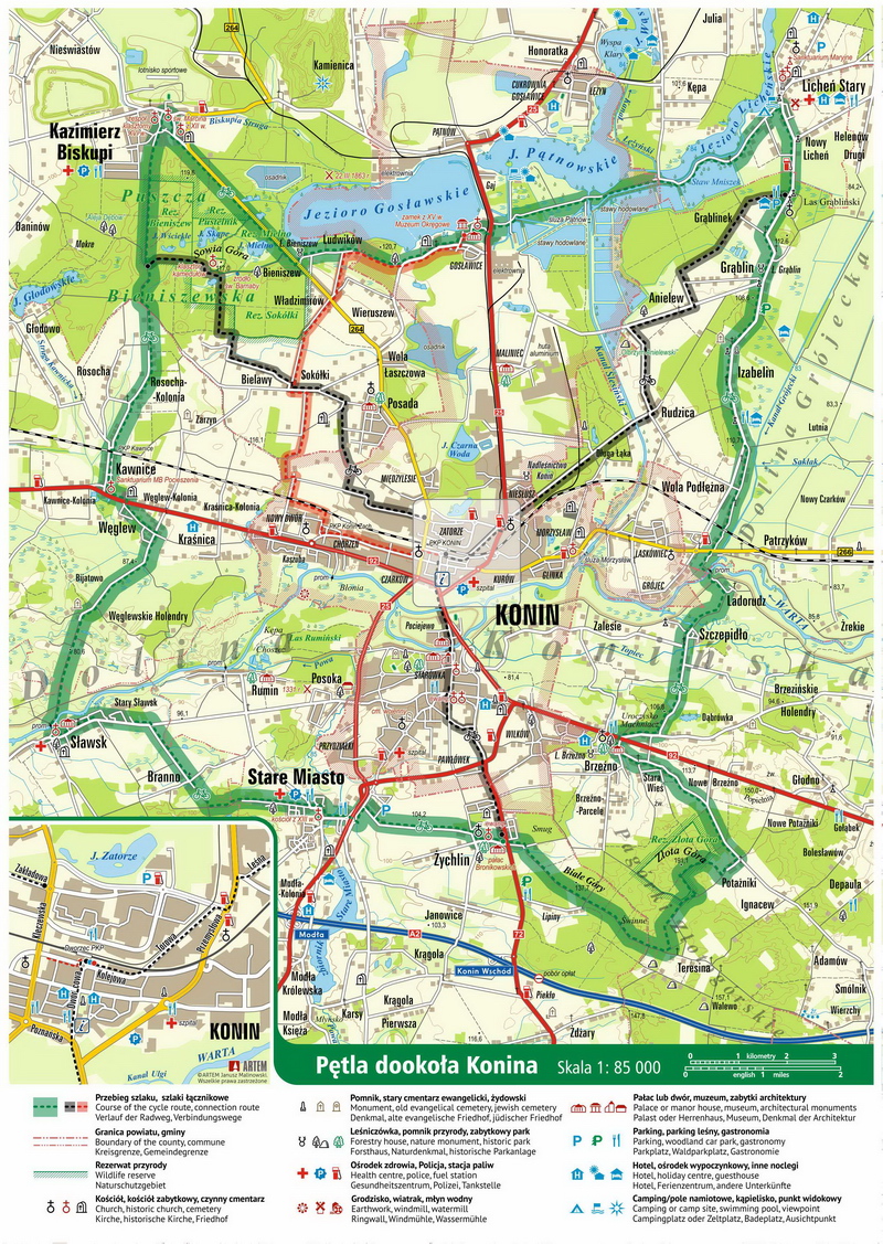 Cała pętla dookoła Konina liczy ponad 70 km oznakowanego szlaku rekreacyjnego (trasa zielona). Szlaki czarne, stanowią uzupełnienie szlaku zielonego i obejmują trzy rekreacyjne trasy o długości nie przekraczającej 13 km, z których każdy swój początek ma w Koninie.