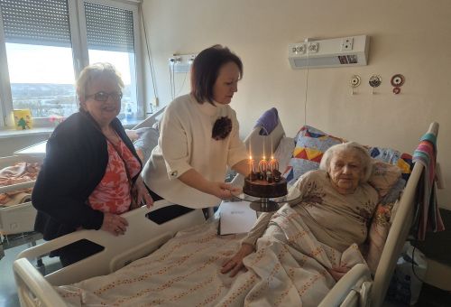 Na zdjęciach widać jubilatkę leżącą na łóżku. Jest zdjęcie portretowe, wspólne z gośćmi podczas dmuchania świeczek na torcie i zdjęcie czarno-białe z czasów młodości.