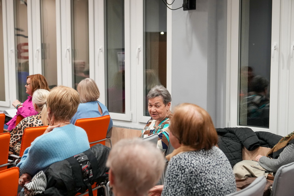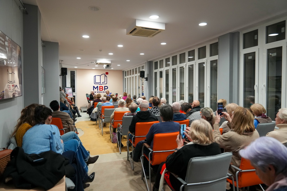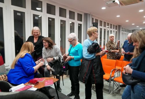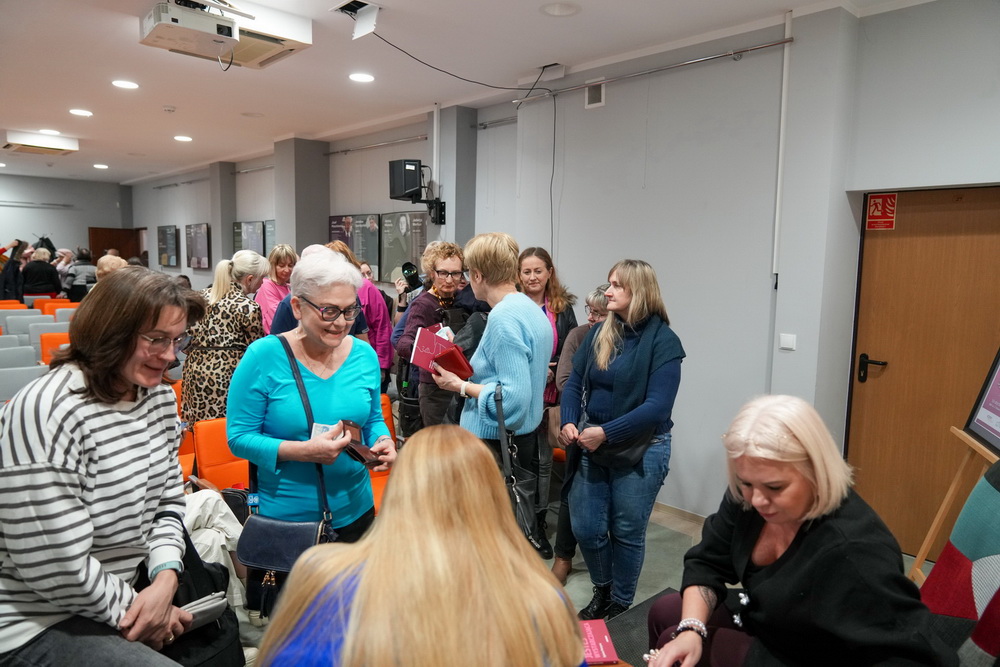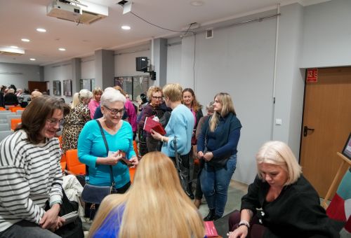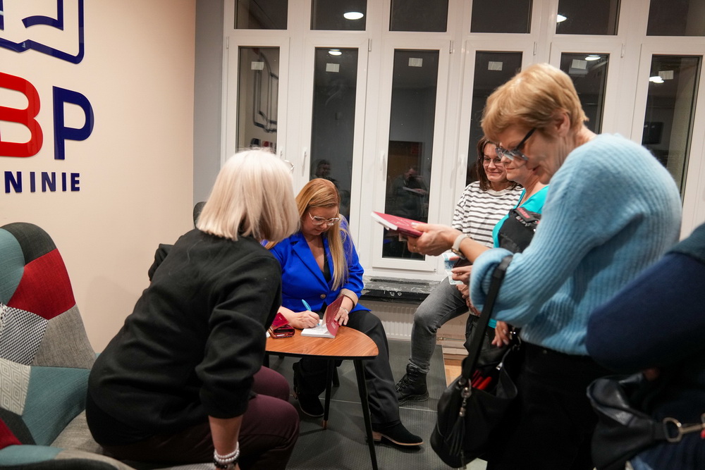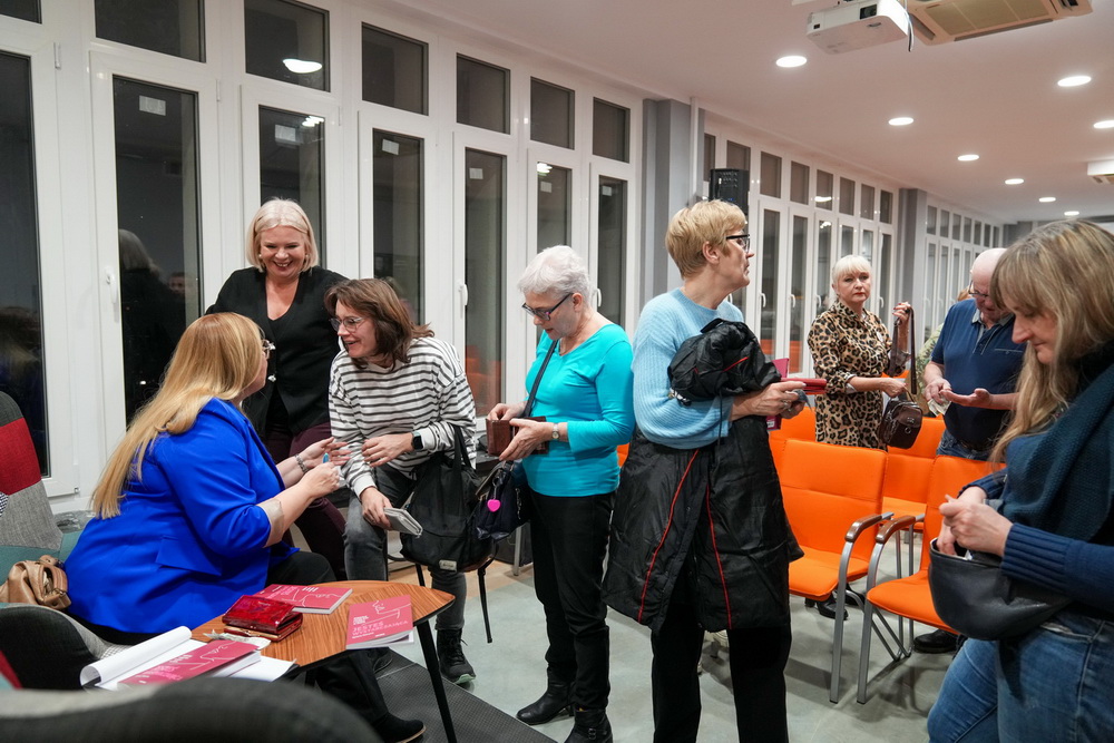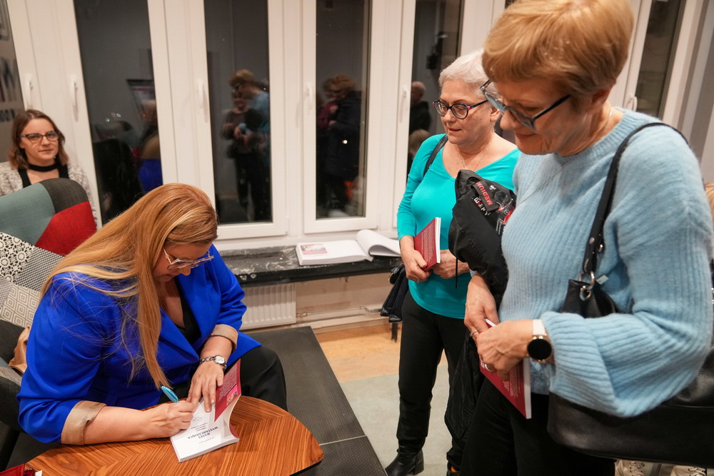 Zdjęcia pokazują grupę czytelniczek i czytelników na widowni, prowadzącą i gościnię podczas rozmowy, a także moment podpisywania książek, kiedy autorkę otacza grupka miłośników jej pisarstwa.