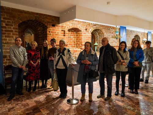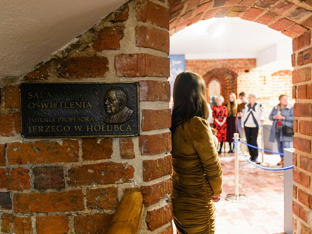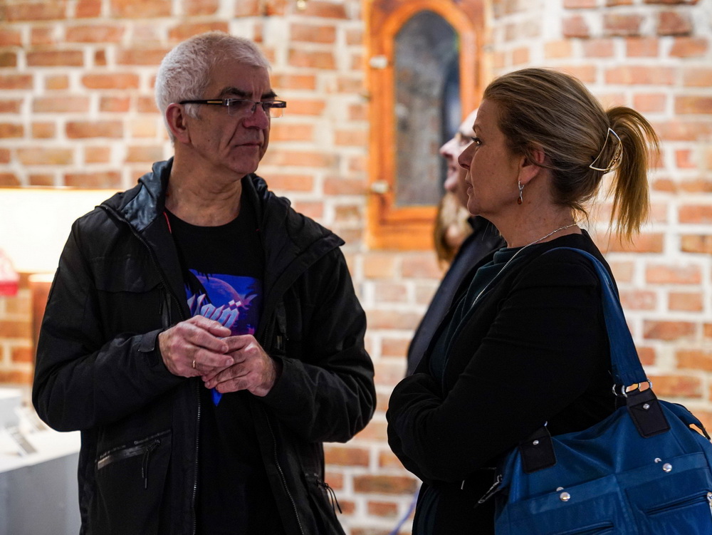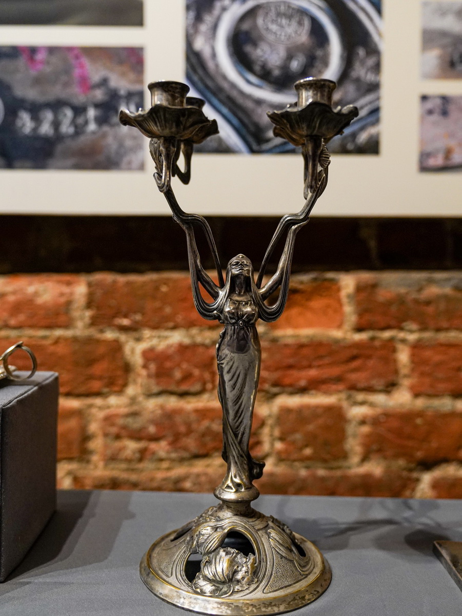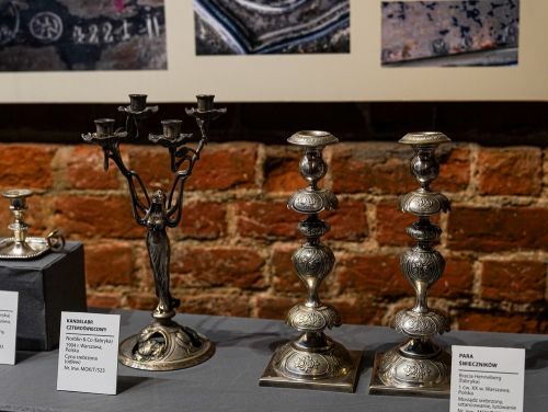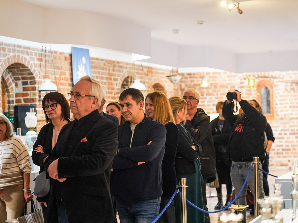 Na zdjęciach widać elementy ekspozycji, świeczniki oraz oglądających.