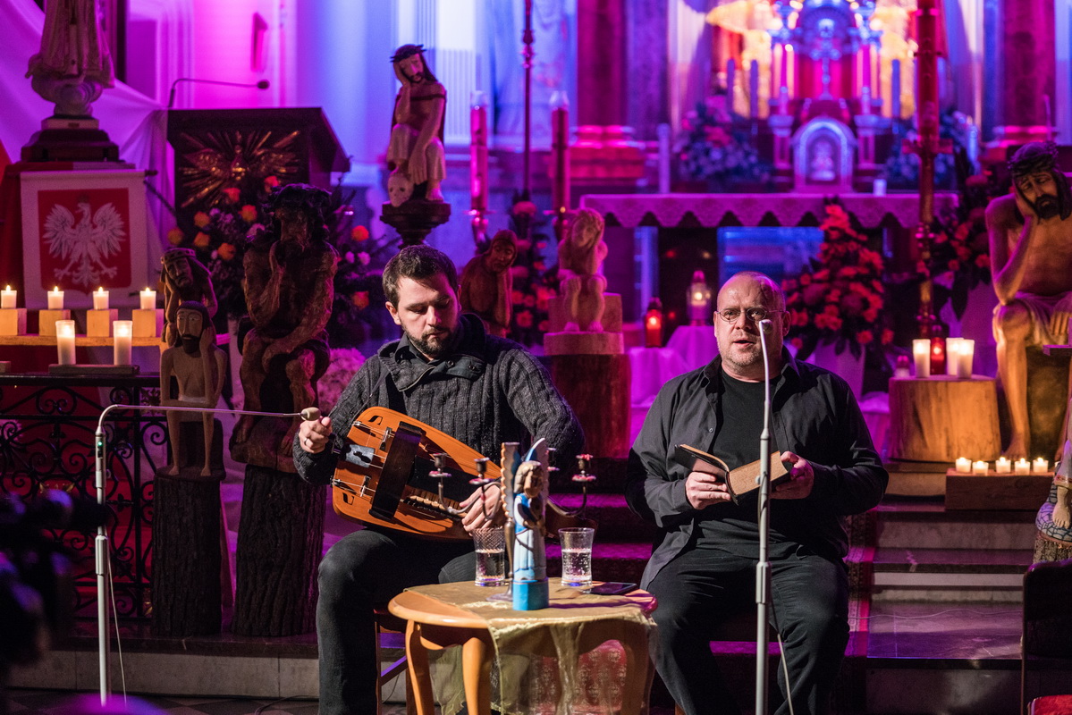 Przed licznie zgromadzoną publicznością zaprezentowali się artyści niezwykli. Adam Strug – śpiewak, instrumentalista, autor piosenek, kompozytor muzyki teatralnej i filmowej, pomysłodawca zespołu Monodia Polska praktykującego pieśni przekazywane w tradycji ustnej. Śpiewakowi towarzyszył grający na lirze korbowej Hipolit Woźniak multiinstrumentalista, kompozytor, śpiewak Monodii Polskiej.