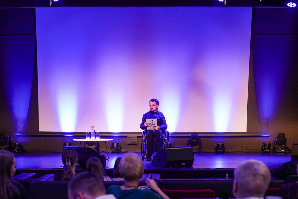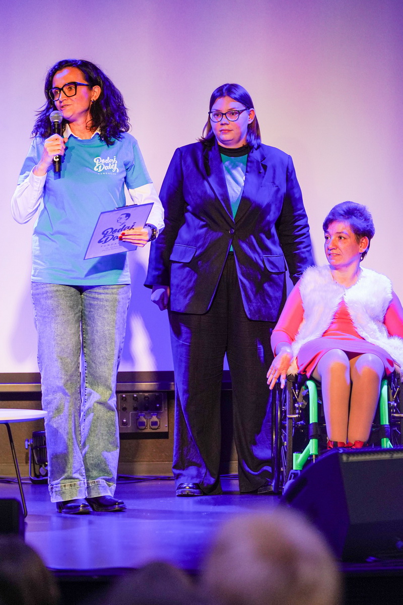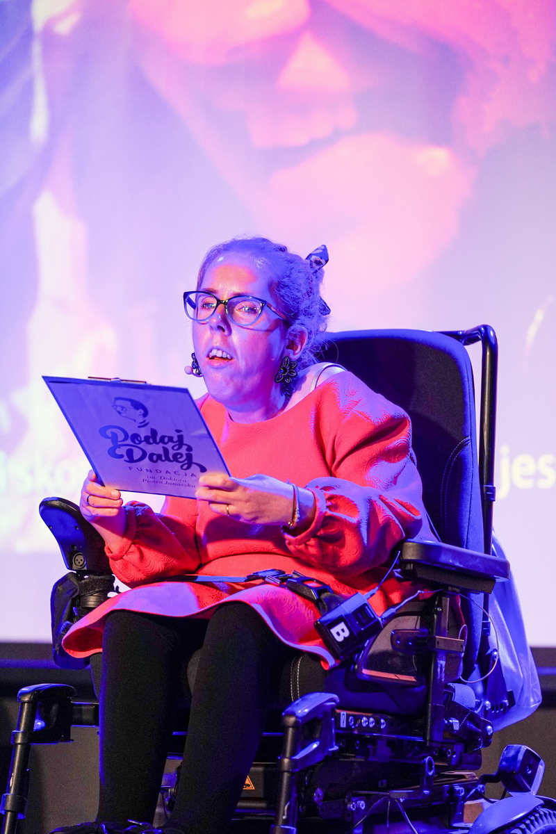 Nim jednak na scenie pojawili się główni bohaterowie wieczoru, swój wykład o spadochroniarstwie uprawianym przez osoby z niepełnosprawnościami wygłosiła prekursorka tego nurtu – Kasia Śmiałek. Przypomniała w nim rolę wolontariuszy, którzy są przede wszystkim przyjaciółmi wspierającymi niepełnosprawnych w każdej sytuacji. Po niej głos zabrały przedstawicielki „Podaj Dalej”, które także dziękowały wolontariuszom, a prezeska Fundacji Zuzanna Janaszek-Maciaszek zaprosiła wolontariuszy do odebrania certyfikatów i nagród.