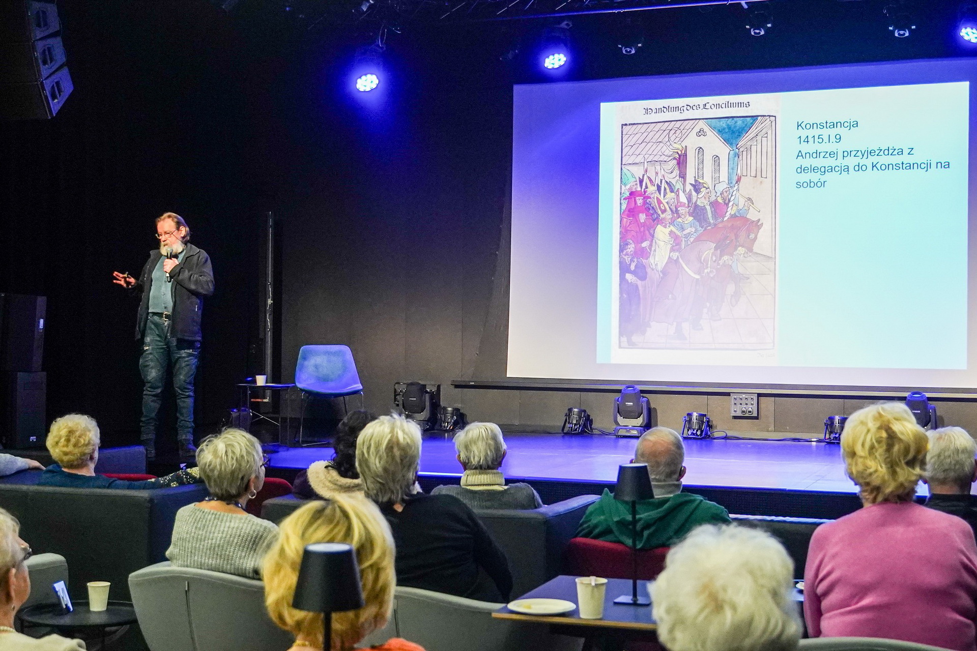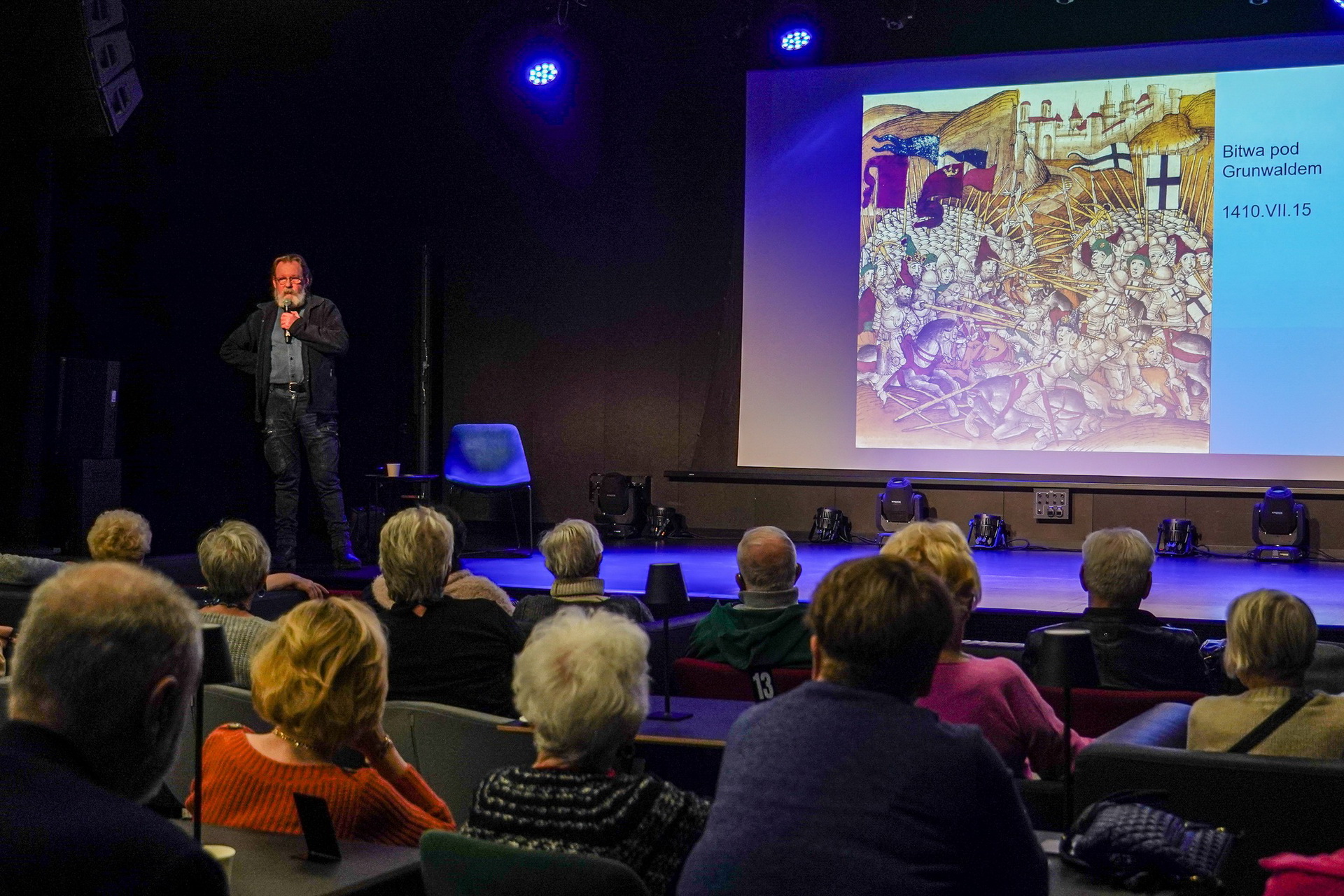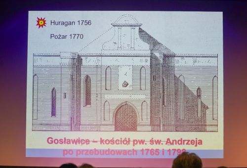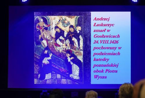 Ważną część prezentacji stanowiło omówienie miejsca szczególnie związanego z Łaskarzami, czyli Gosławice. Prelegent zaprezentował historię powstania kościoła i zamku oraz zwrócił uwagę na wyjątkowy program heraldyczny gosławickiej świątyni. Podkreślił znaczenie kamiennej chrzcielnicy oraz układu herbów, które odpowiednio odczytane – ukazują ideę fundacyjną i symboliczny przekaz twórców świątyni. Spotkanie zakończyła dyskusja z udziałem publiczności. Pytania dotyczyły zarówno mniej znanych wątków z życia Andrzeja Łaskarza, jak i współczesnych interpretacji jego działalności oraz stanu badań nad gosławickim zespołem architektonicznym. Wykład po raz kolejny pokazał, jak silnie historia biskupa wpisuje się w dzieje Konina i jak wiele wciąż pozostaje do odkrycia w związku z jego europejską aktywnością.