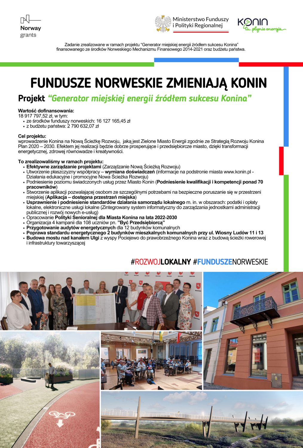 Na realizację zaplanowanych działań Miasto Konin otrzymało z Funduszy Norweskich oraz z budżetu państwa ponad 15 milionów zł. Obecnie oczekujemy na wybór partnera projektu przez ministerstwo. Dzięki temu stworzymy m.in. aplikację pozwalającą osobom ze szczególnymi potrzebami na bezpieczne poruszanie się w przestrzeni miejskiej, ułatwimy dostęp do e-usług, wyposażymy Inkubator Aktywności Kulturalnej, opracujemy politykę senioralną w mieście, przygotujemy audyty energetyczne dla 12 budynków komunalnych, przeprowadzimy termomodernizację 2 lub 3 budynków mieszkalnych komunalnych. Wybudujemy ścieżkę rowerową oraz kładkę nad kanałem Ulgi z wyspy Pociejewo do prawobrzeżnego Konina.