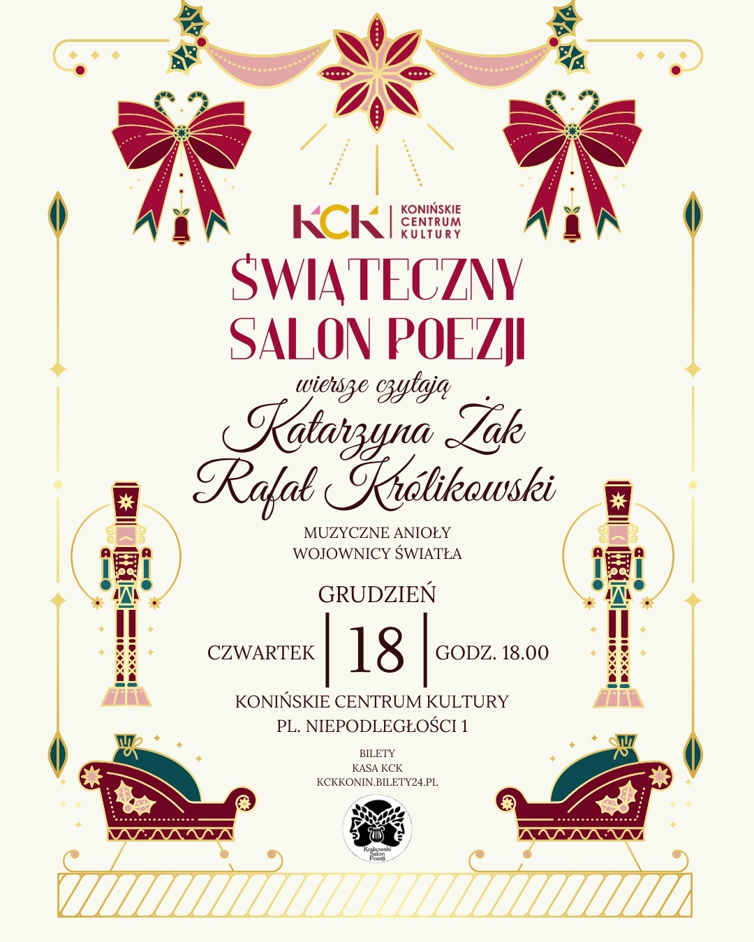 Dwoje wspaniałych aktorów przeczyta poezje o tematyce bożonarodzeniowej. W Salonie Poezji i Literatury Anny Dymnej wystąpią Katarzyna Żak i Rafał Królikowski. Będzie to wydanie świąteczne i rodzinne, dlatego do Konińskiego Centrum Kultury zapraszamy dzieci, rodziców, dziadków i wszystkich im bliskich. Wydarzenie odbędzie się 18 listopada na Dużej Scenie przy pl. Niepodległości 1. Będzie Wigilia – uśmiechną się ludzie!