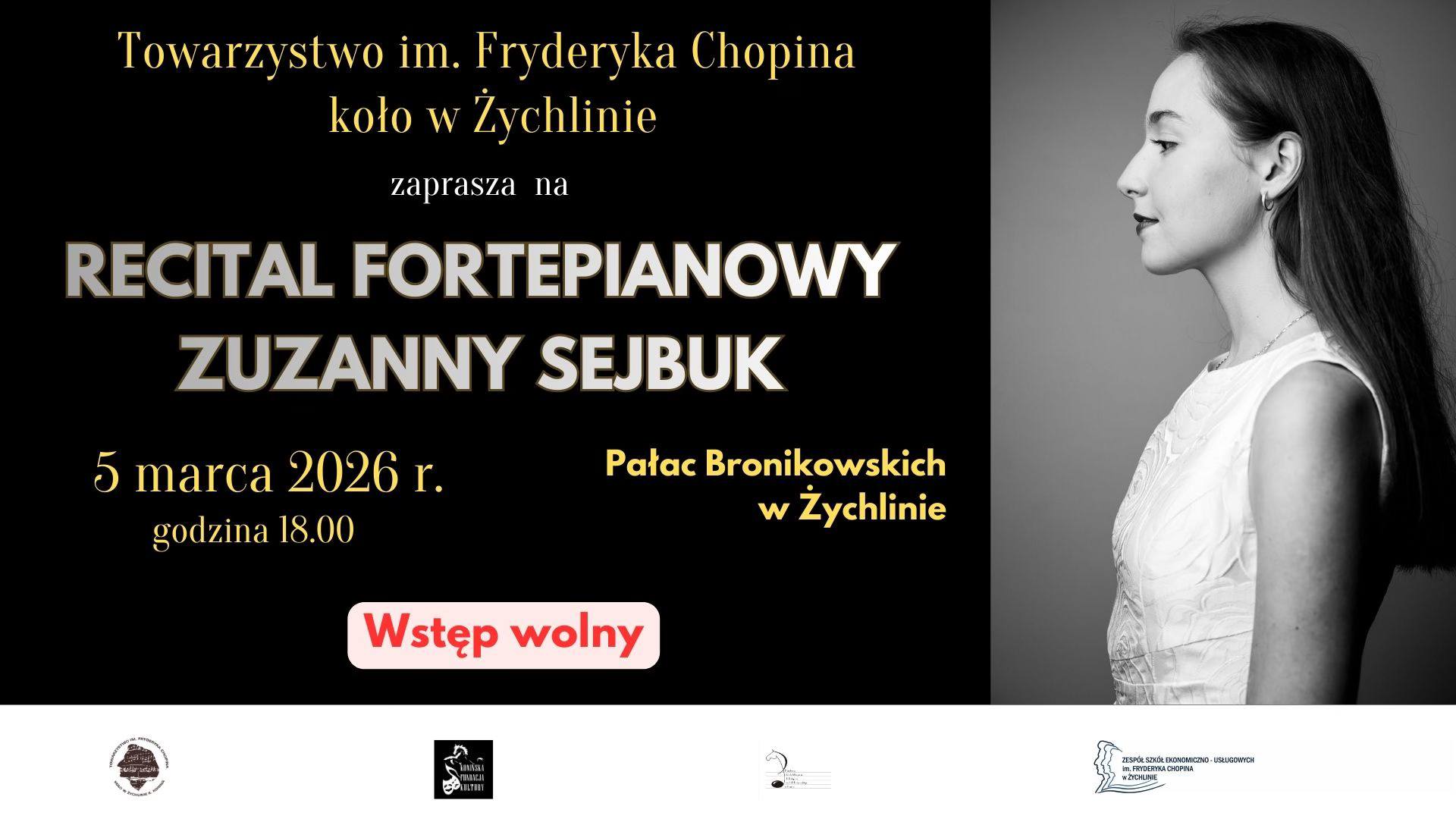 Towarzystwo im. Fryderyka Chopina koło w Żychlinie ma zaszczyt zaprosić Państwa na niezapomniany Recital Fortepianowy Zuzanny Sejbuk.