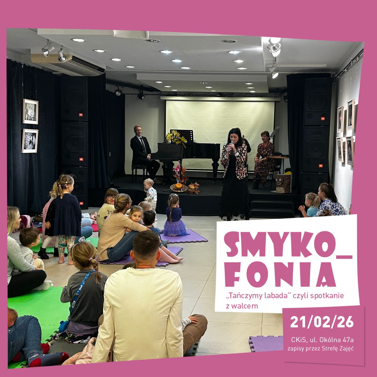 Smykofonia to koncerty edukacyjne skierowane do najmłodszych odbiorców muzyki. Zapraszamy dzieci od 1 do 7 roku życia wraz z rodzicami. Prowadząca, dr Adriana Wdziękońska, z dużą uważnością konstruuje program każdego spotkania. Podczas koncertów rozbrzmiewa muzyka klasyczna, a także popularne, łatwe do zaśpiewania piosenki dla dzieci. Mali uczestnicy poznają instrumenty muzyczne i aktywnie biorą udział w muzycznych zabawach.