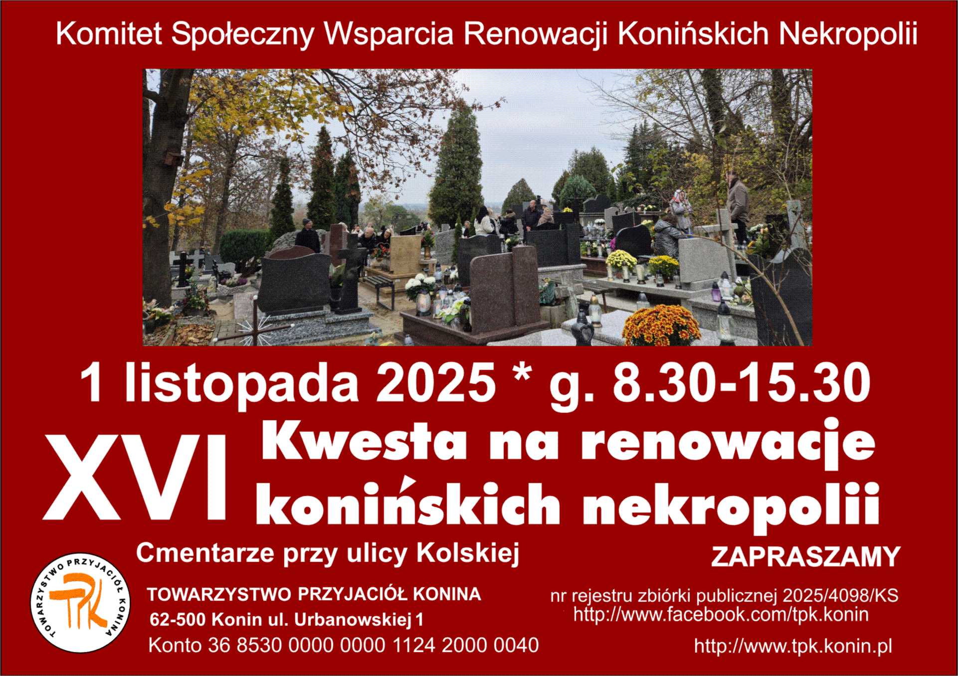 Kwesta będzie odbywać się na terenie cmentarza katolickiego i ewangelickiego przy ul. Kolskiej, a każdy datek przyczyni się do kontynuacji prac konserwatorskich i utrzymania tych miejsc w godnym stanie.